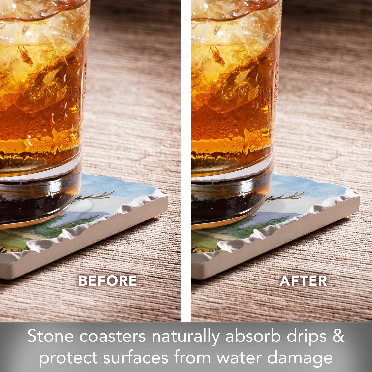 ABSORBENT STONE-Coasters arrive as a set of 4 Coasters. Each Coaster is constructed of absorbent stone that continuously absorbs drips and condensation from your beverages while preventing stains and rings on your furniture.