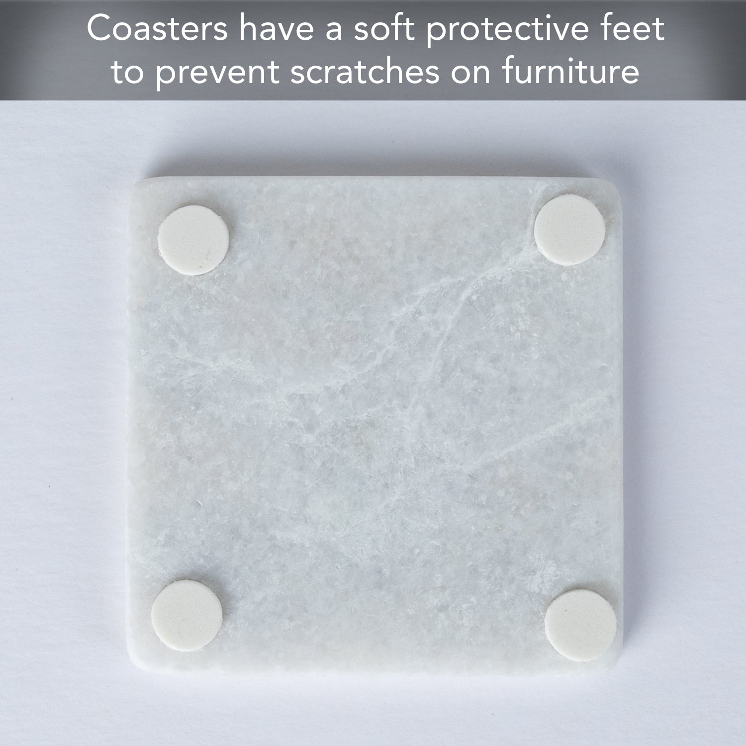 NON-SLIP- Marble coasters have a natural grip and non-slip surface that keeps glasses and mugs from sliding around. Non-Slip feet on bottom of each Coaster keeps the Coaster in place while in use.