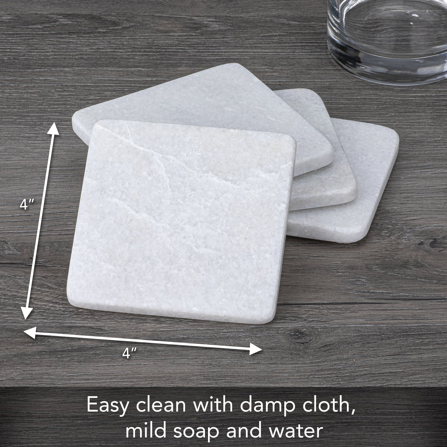 MEASURES- Each Coaster measures 4” square. Marble coasters are easily cleaned with a damp cloth or sponge, making them a low-maintenance option.