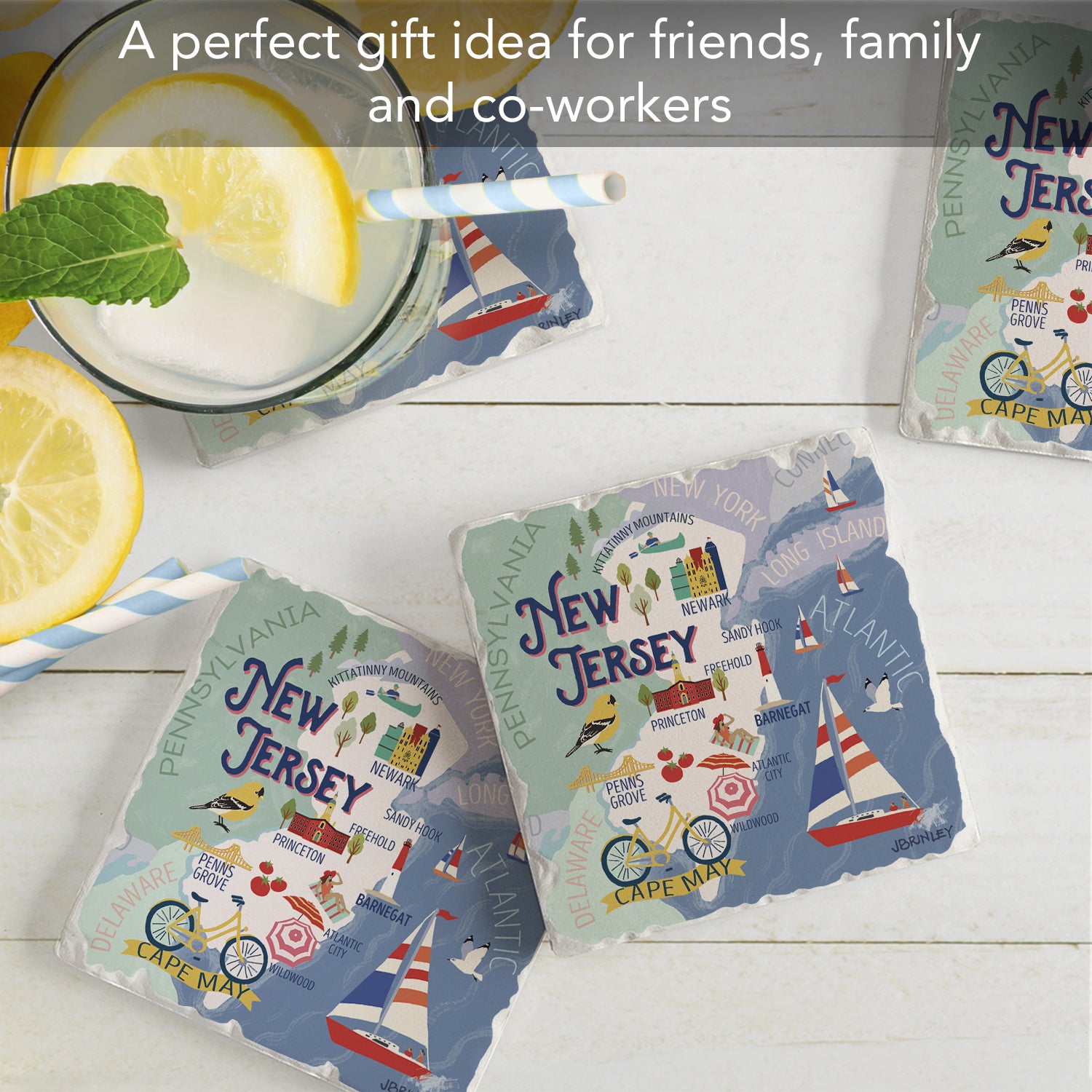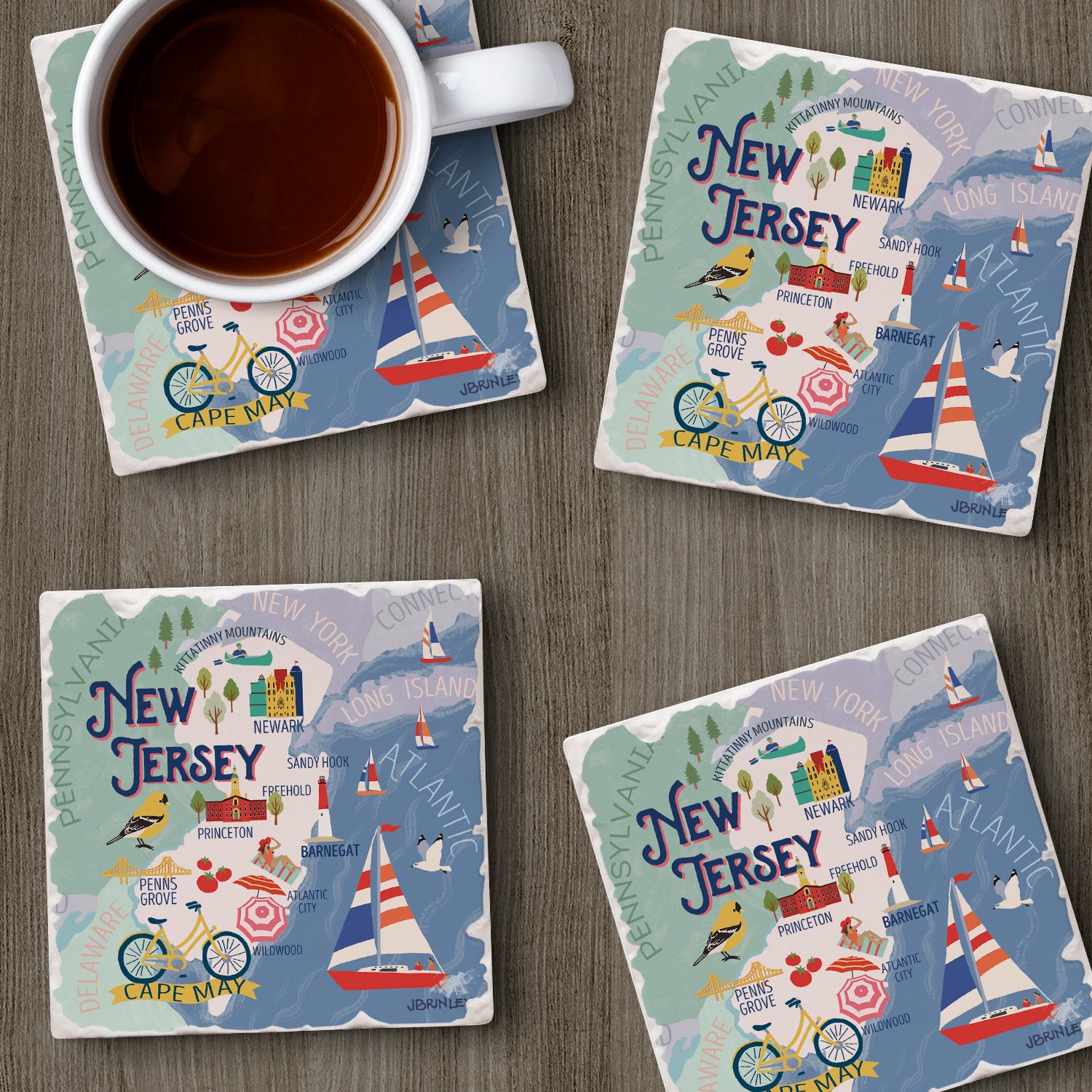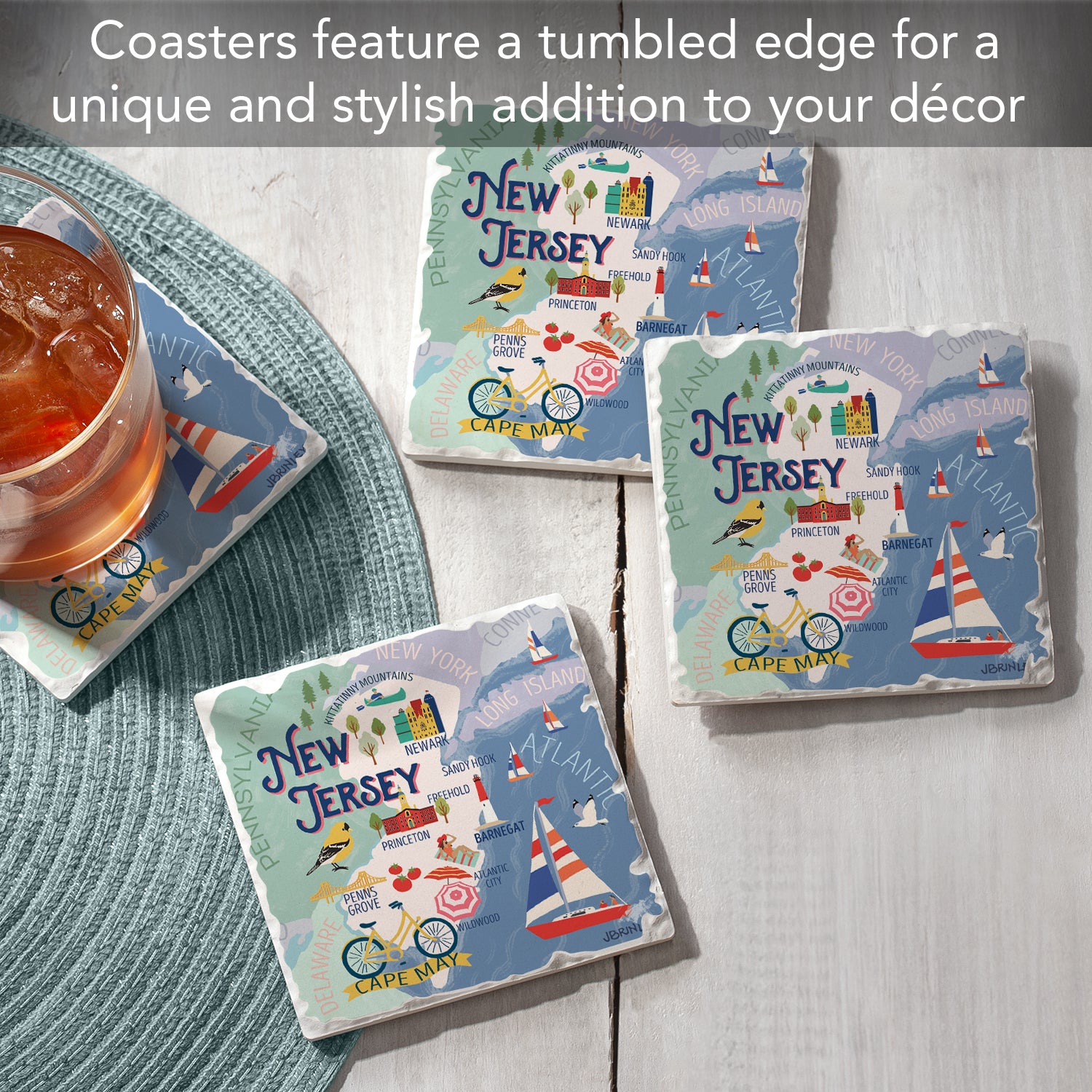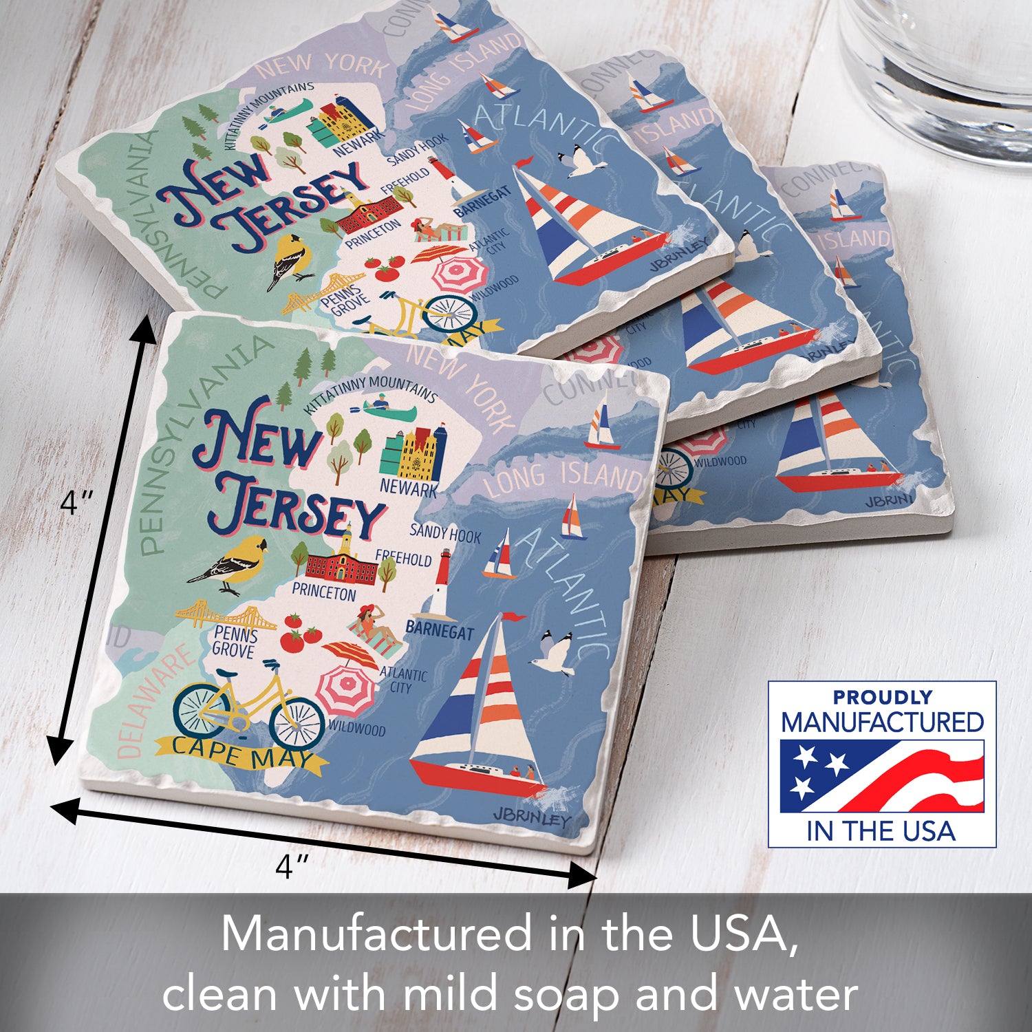 Thirstystone New Jersey Attractions 4 Pack Tumbled Tile Stone Coasters 4” Square Manufactured in the USA