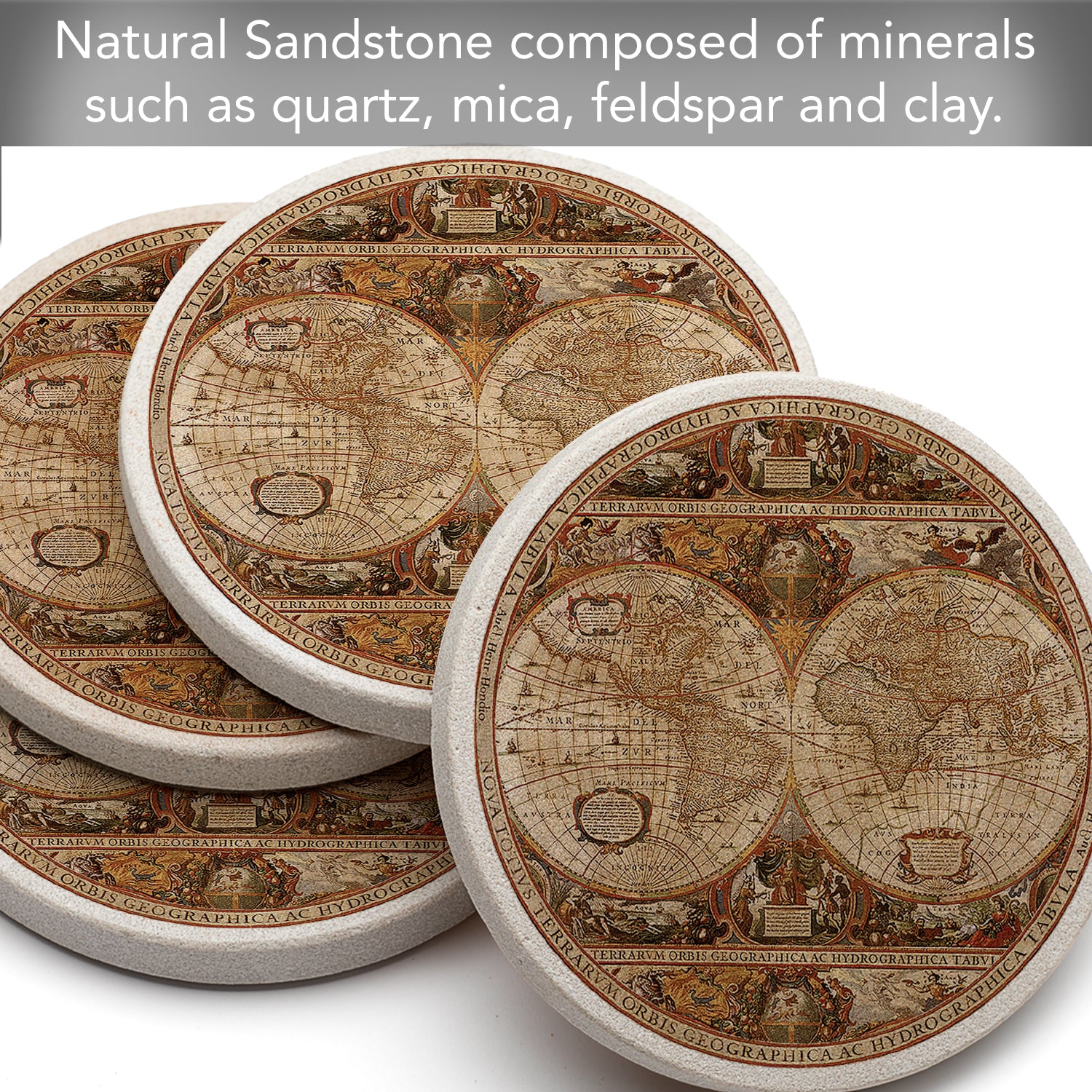 MEASUREMENTS-Each coaster measures 4” round. Sandstone coasters are easy to clean with a damp cloth or sponge. Beautiful artistic design allows the Coasters to remain displayed even when not in use.