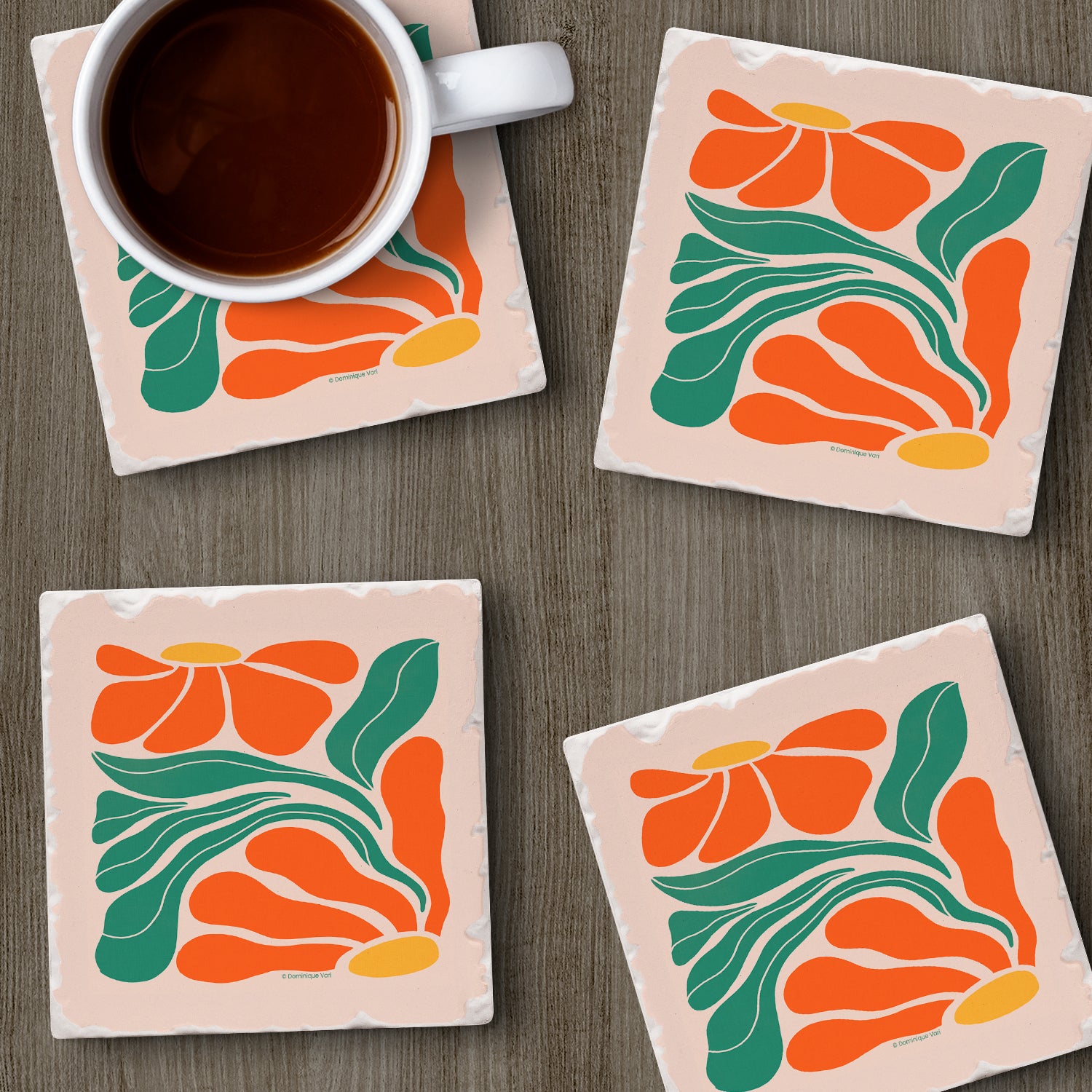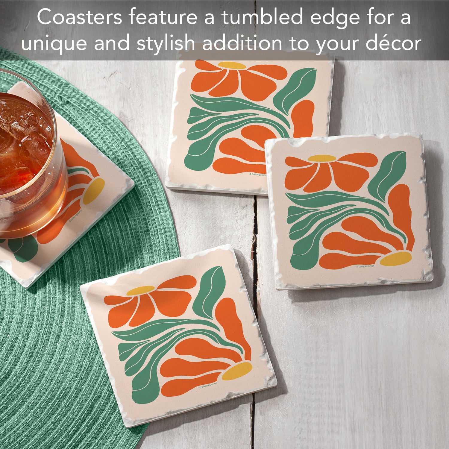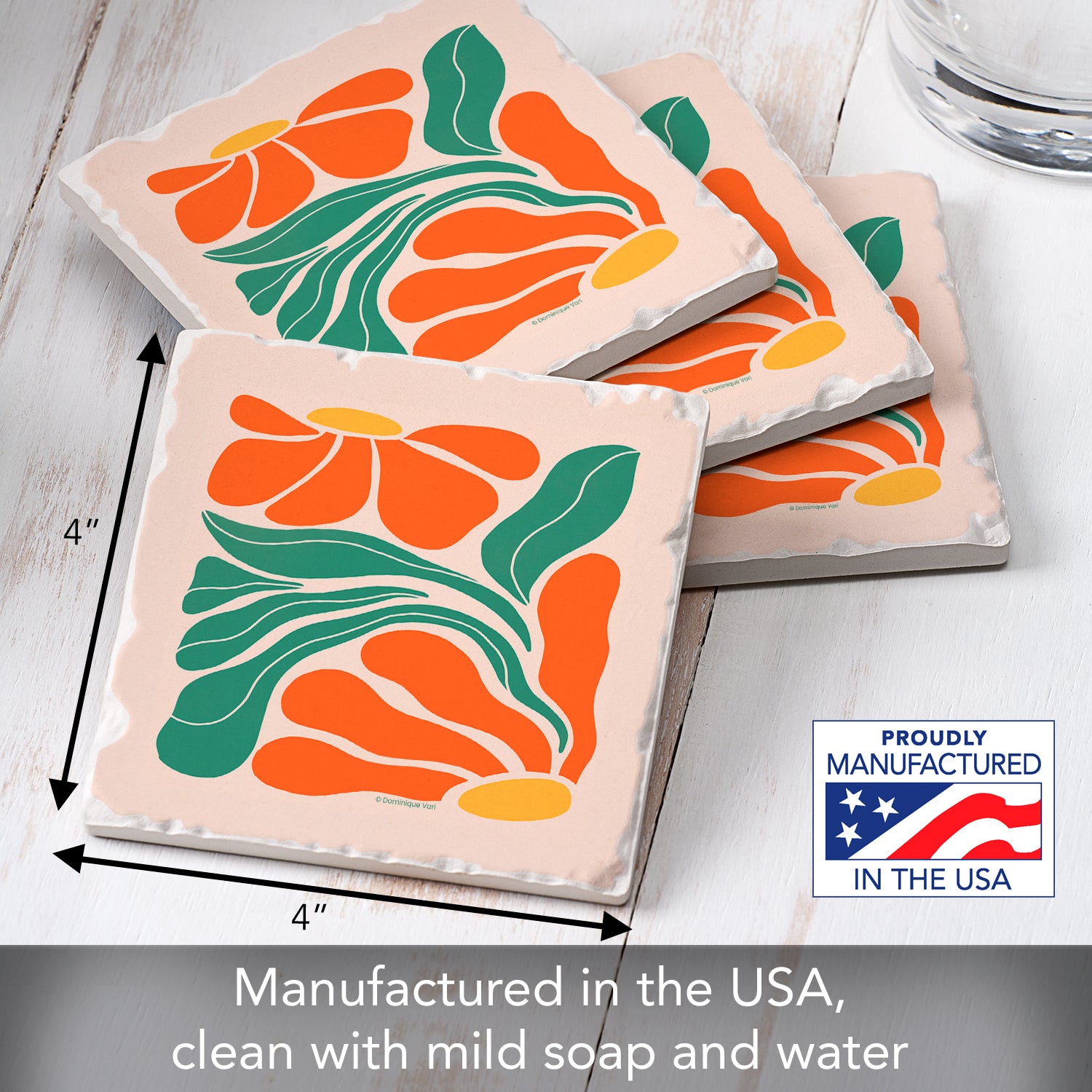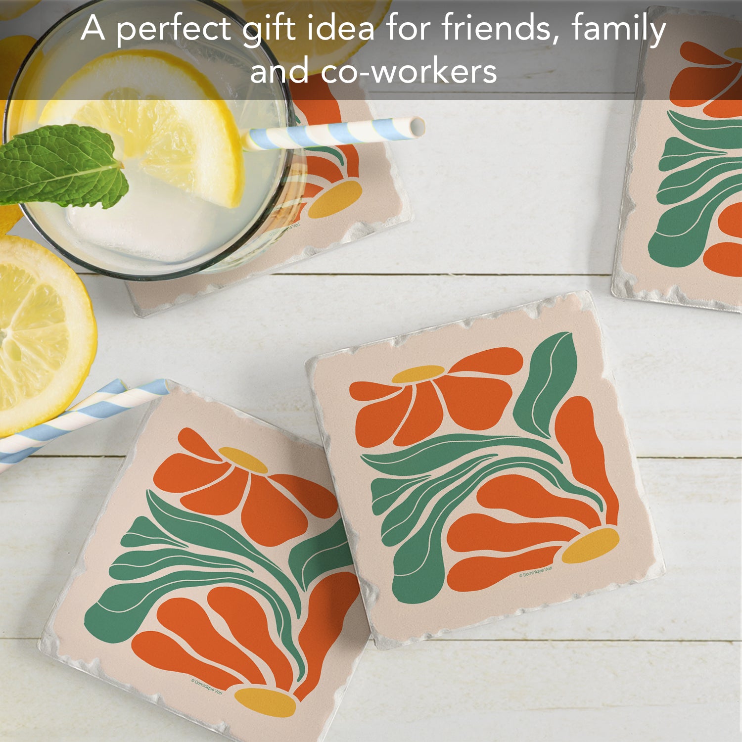 Thirstystone Orange Boho Floral 4 Pack Absorbent Stone Tumbled Tile Stone Coasters 4" Square Manufactured in the USA