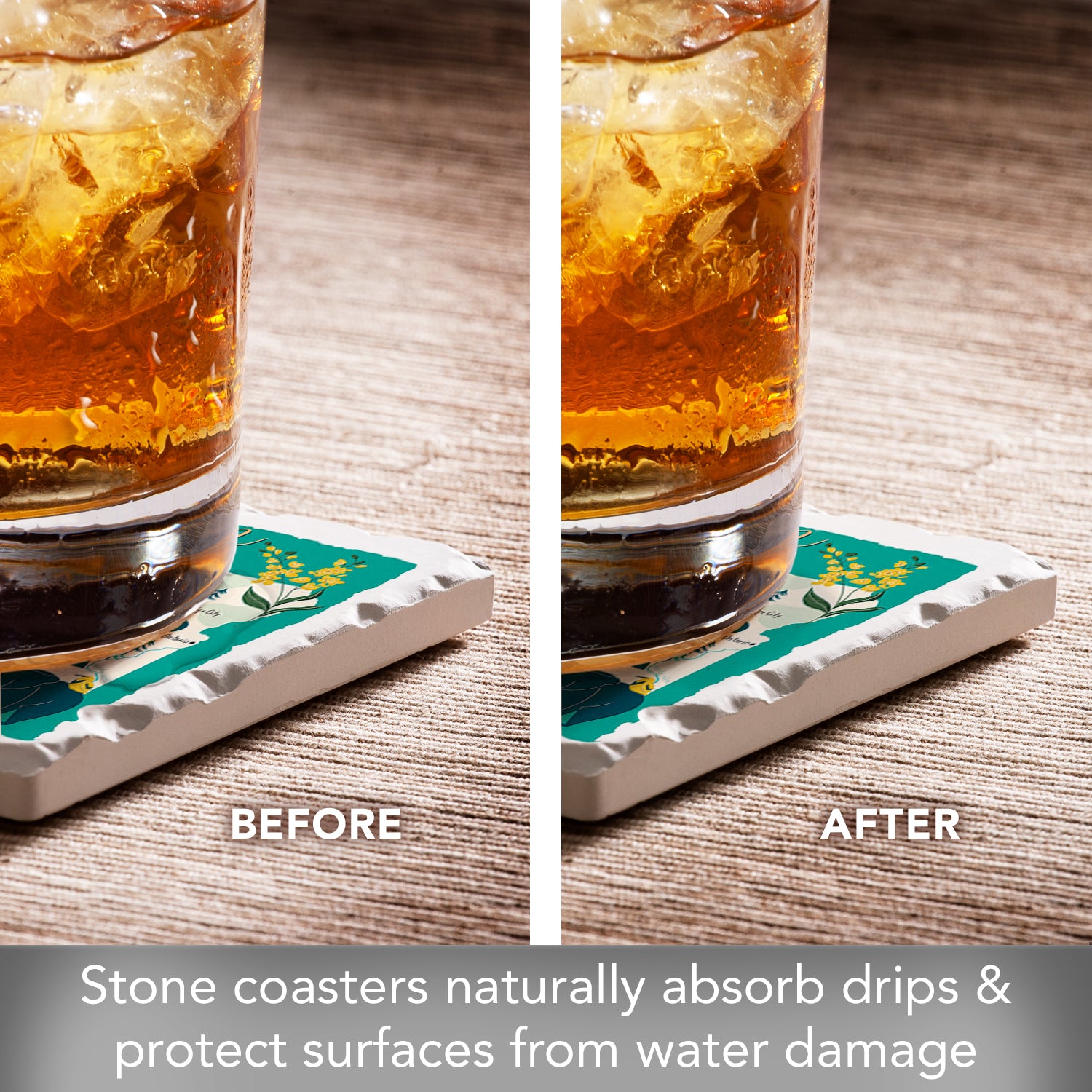 ABSORBENT STONE-Coasters arrive as a set of 4 Coasters. Each Coaster is constructed of absorbent stone that continuously absorbs drips and condensation from your beverages while preventing stains and rings on your furniture.