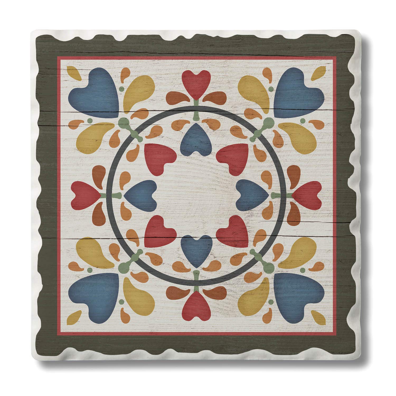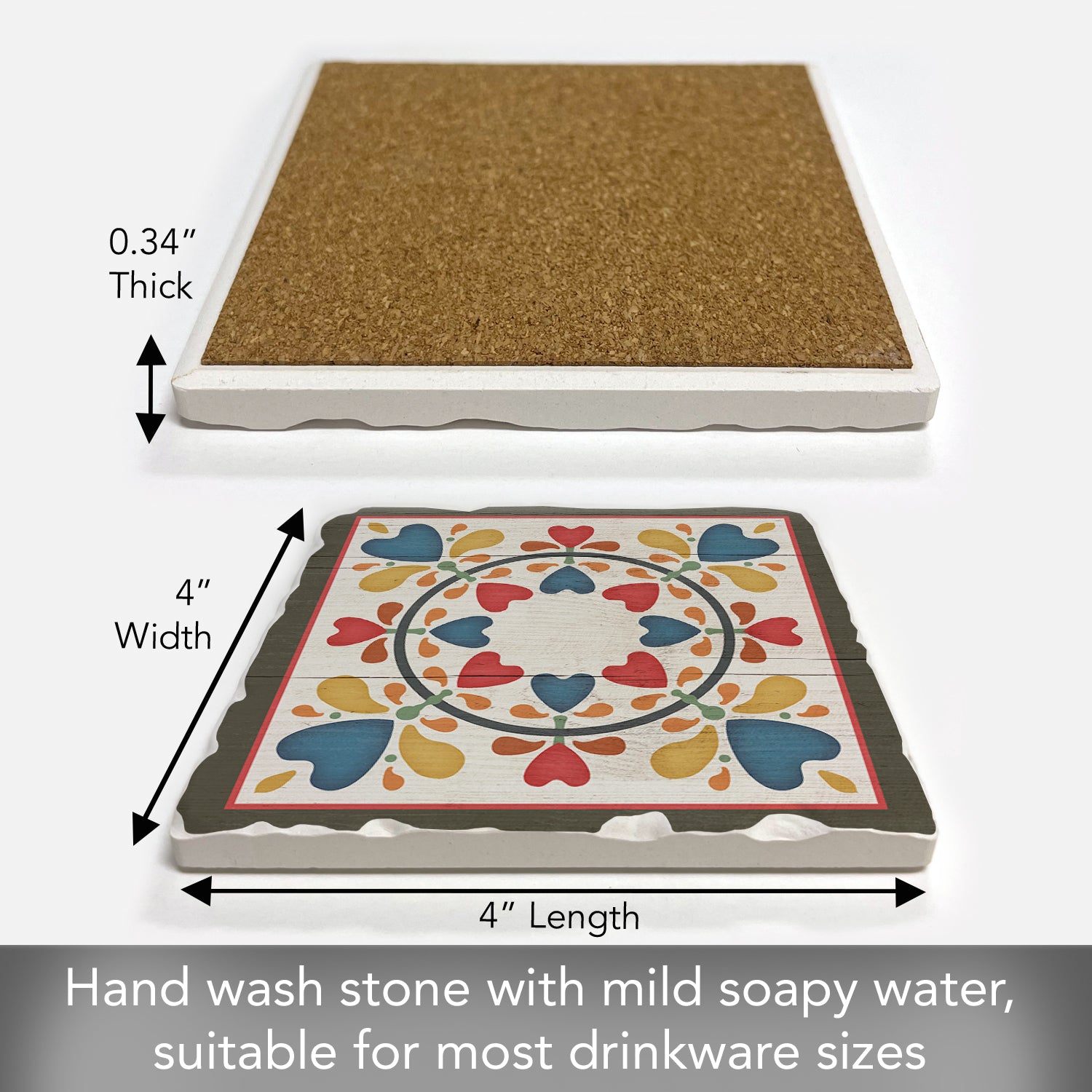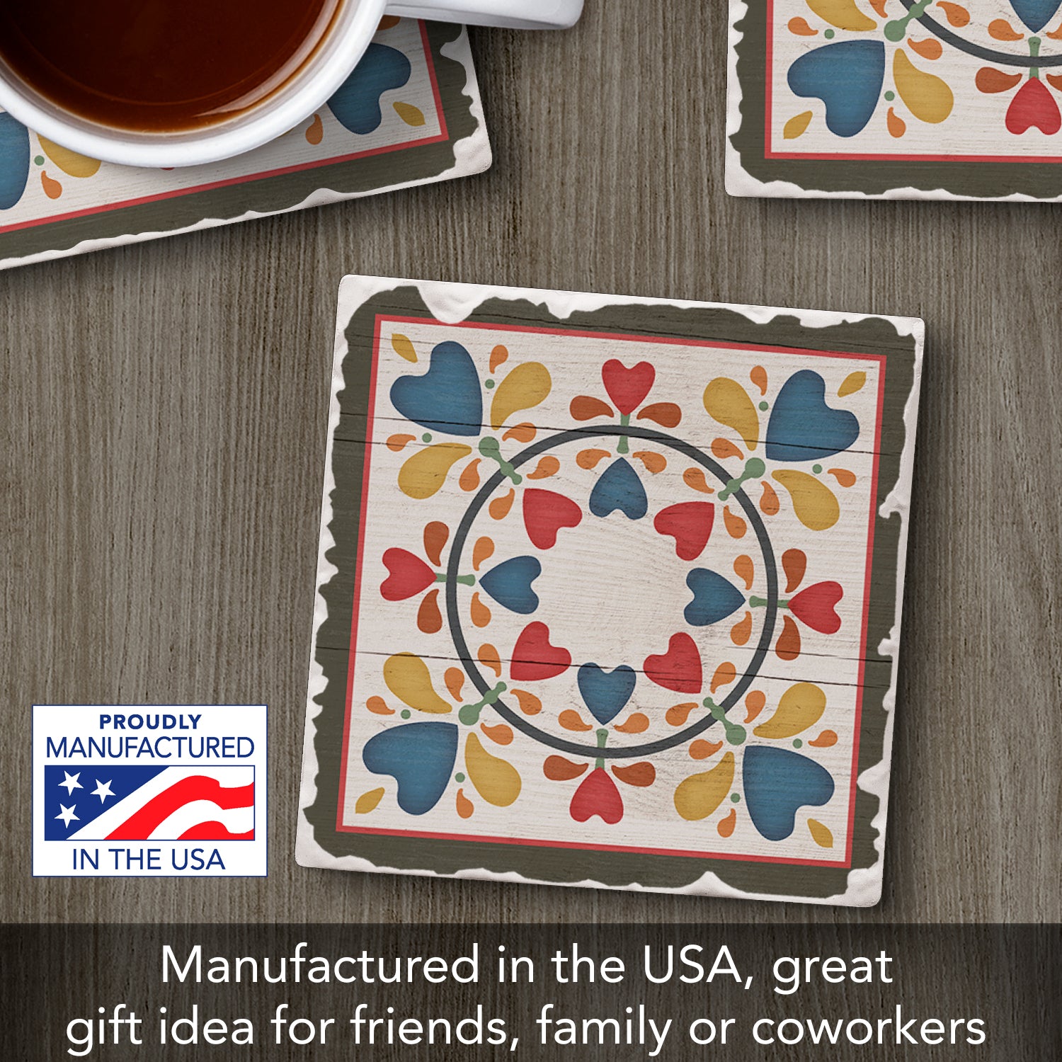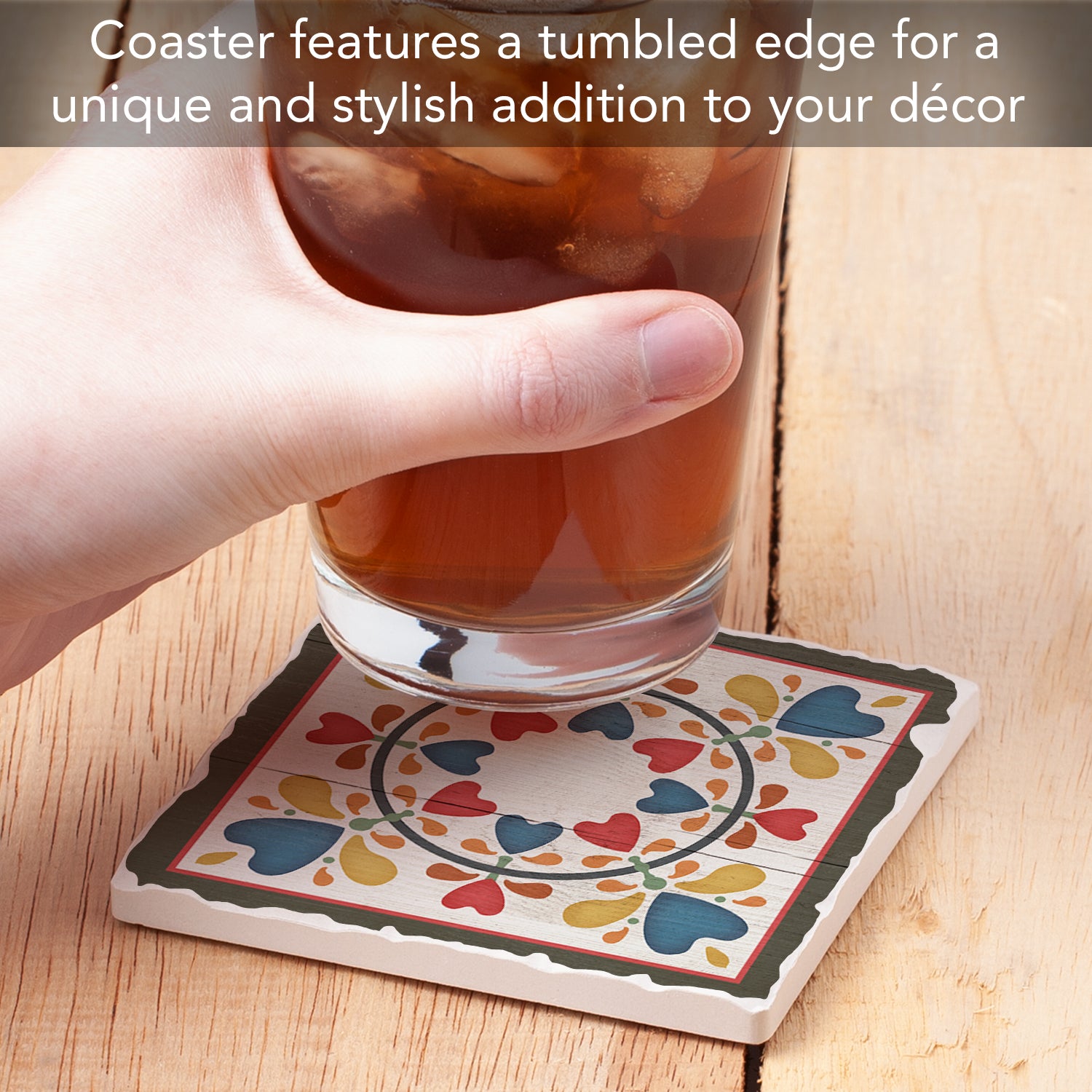 Thirstystone Quilt Design Folk Hearts & Flowers Single Tumbled Tile Stone Coaster with Protective Cork Backing Manufactured in The USA 4" Square, Artistic, Easily Wipes Clean