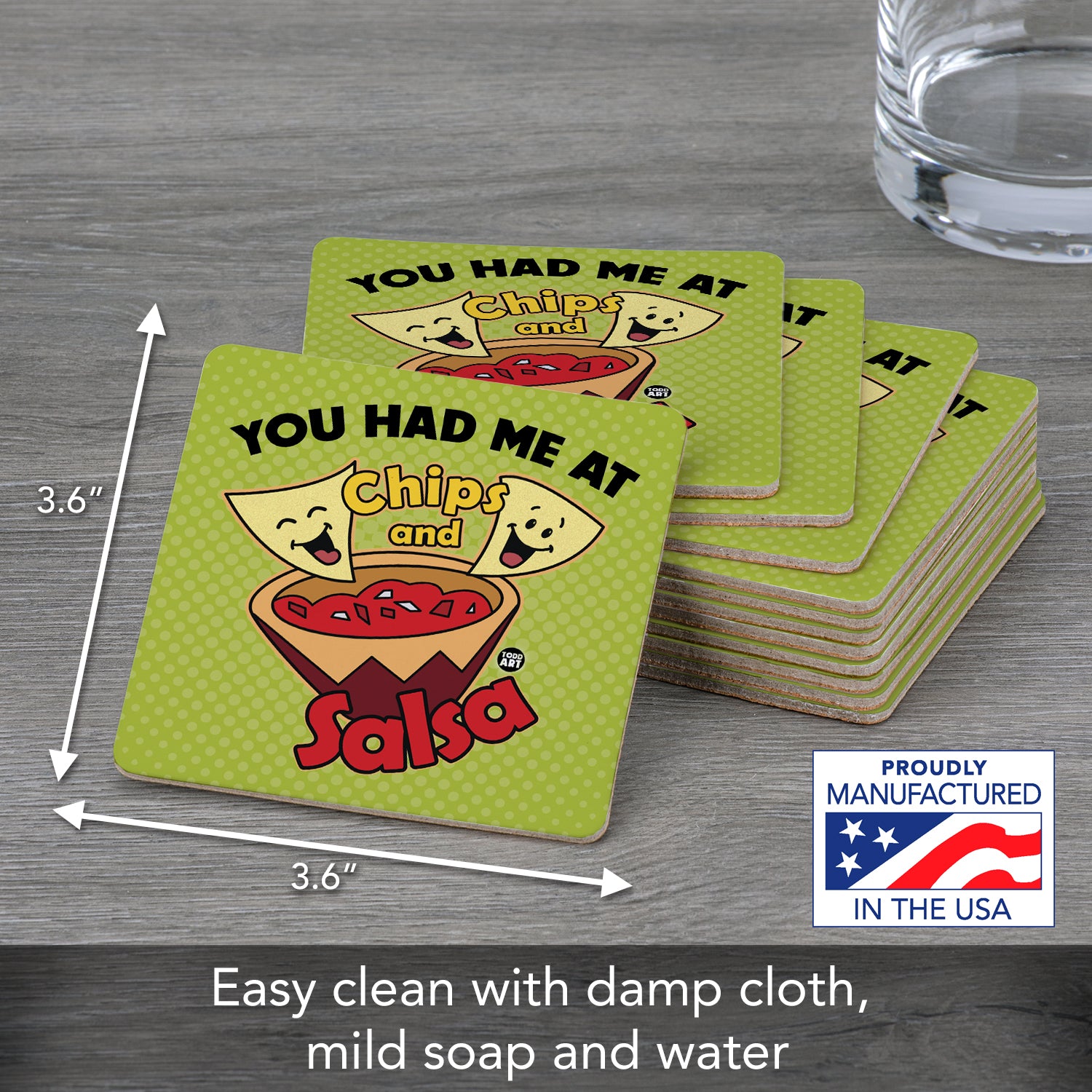 MEASUREMENTS- Coaster measures 3.6" x 3.6" x 0.15" square. Coasters are eco-friendly and reusable until soiled.