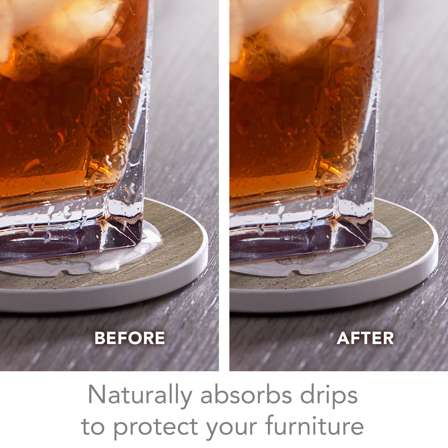 ABSORBENT STONE-Set of 4 natural absorbent stone coasters. Constructed of absorbent stone that absorbs drips and condensation from beverages continuously. Absorption prevents rings and stains on your furniture. Smooth, finished edge completes these round Coasters.