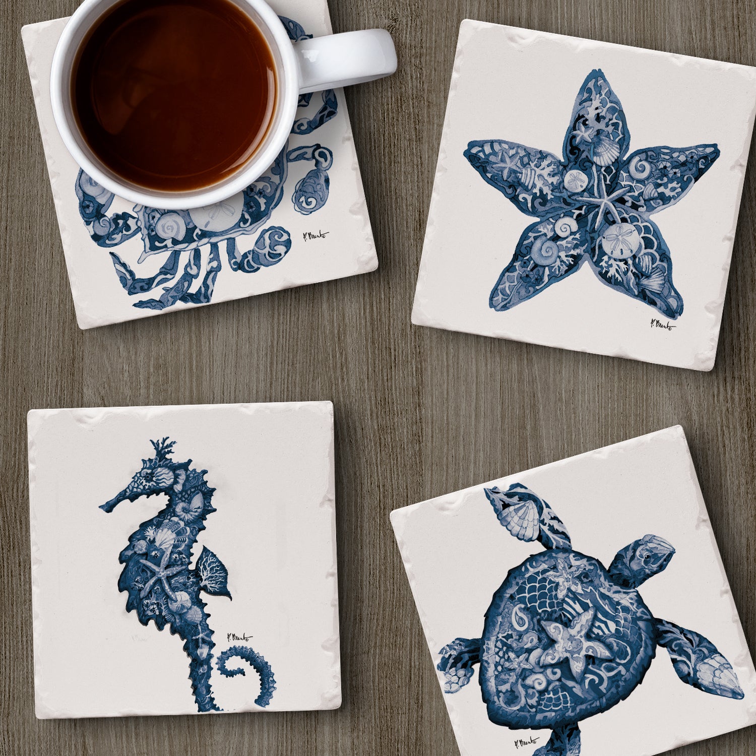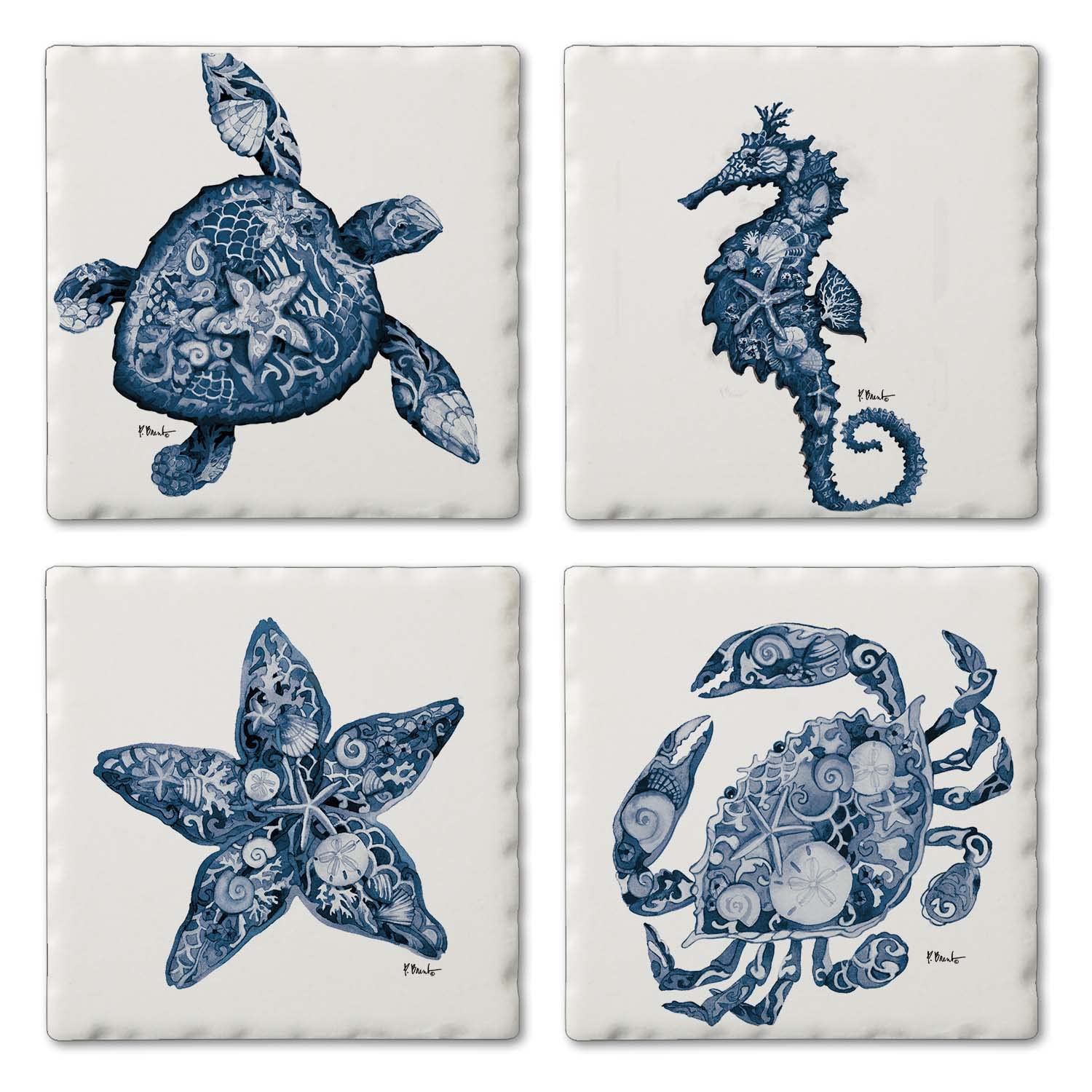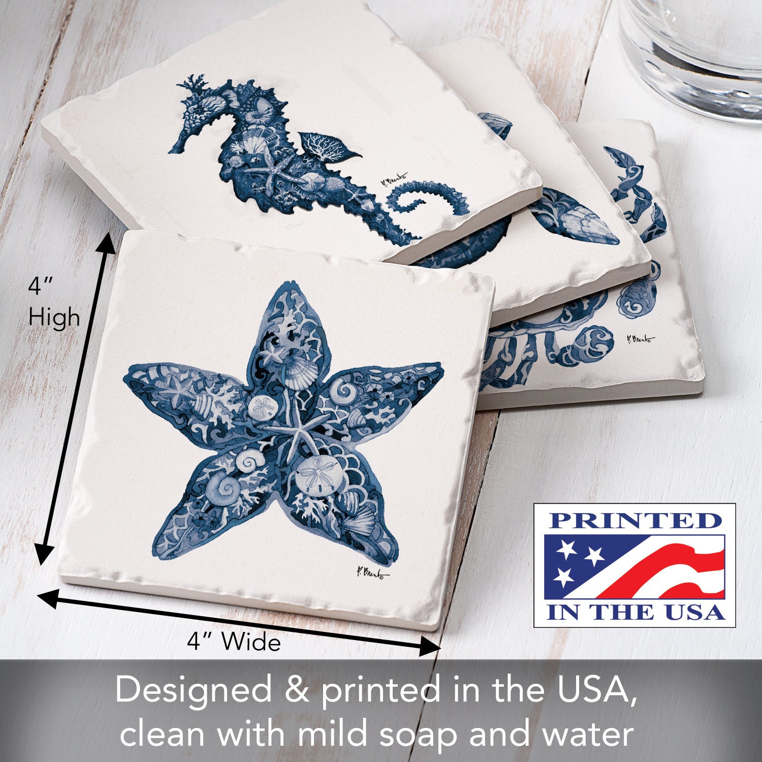 Thirstystone Nassau Sea Life 4-Pack Assorted Tumbled Tile Stone Coasters 4" Square