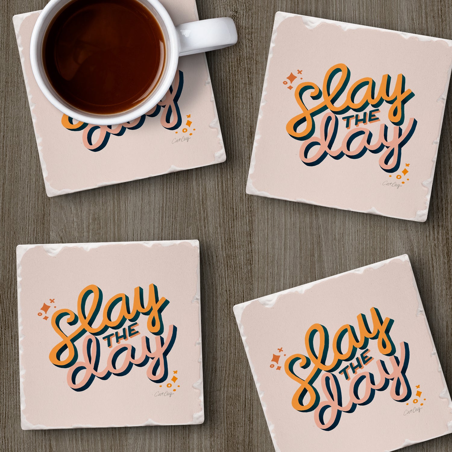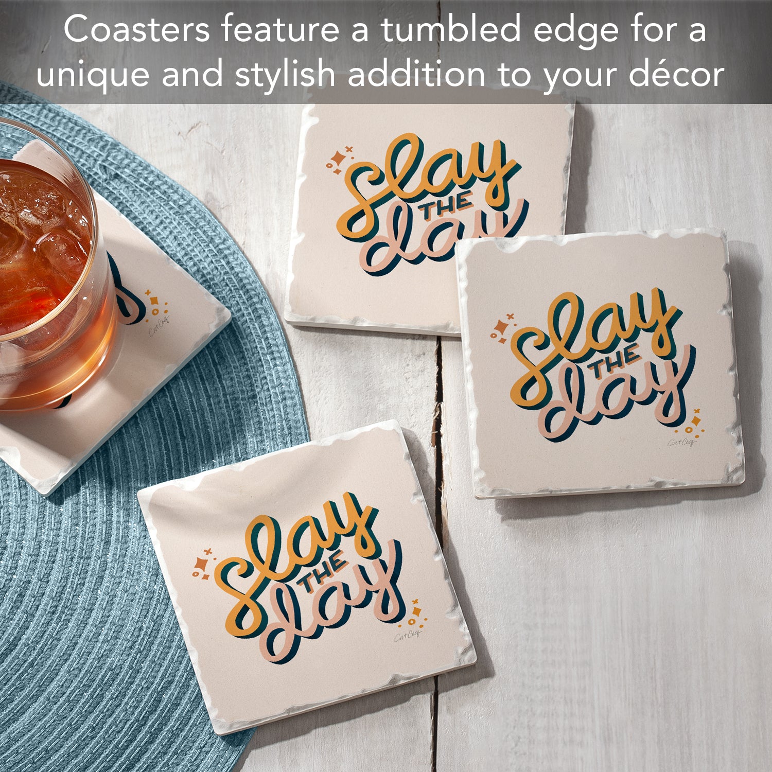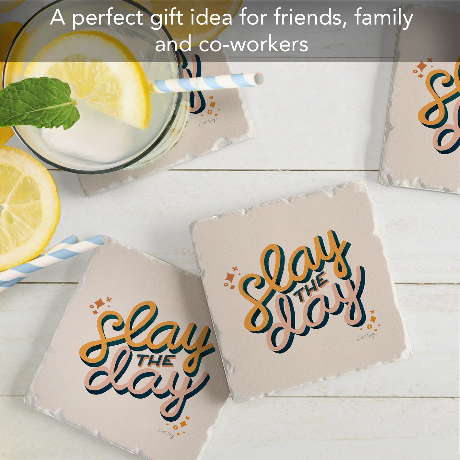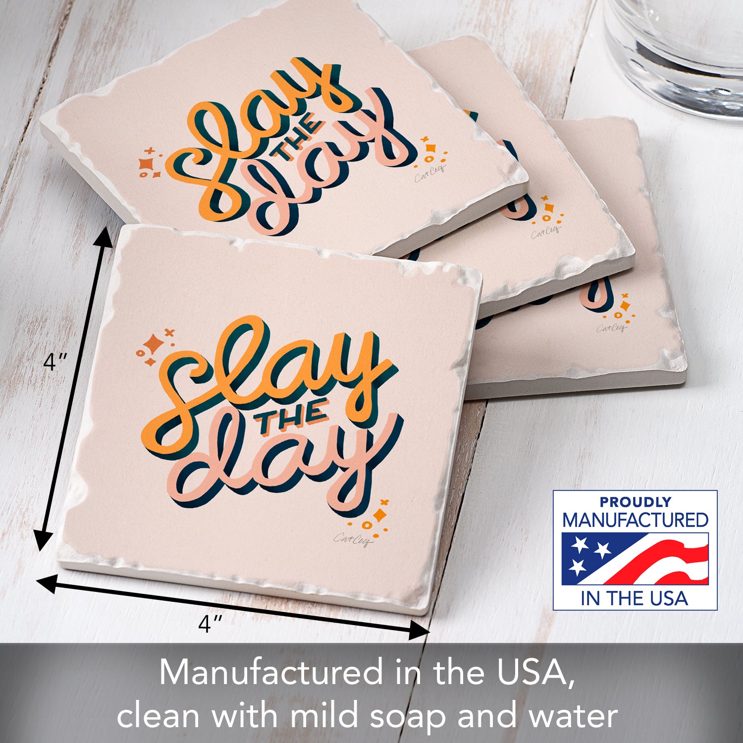 Thirstystone Slay The Day 4 Pack Tumbled Tile Stone Coasters 4" Square Manufactured in the USA