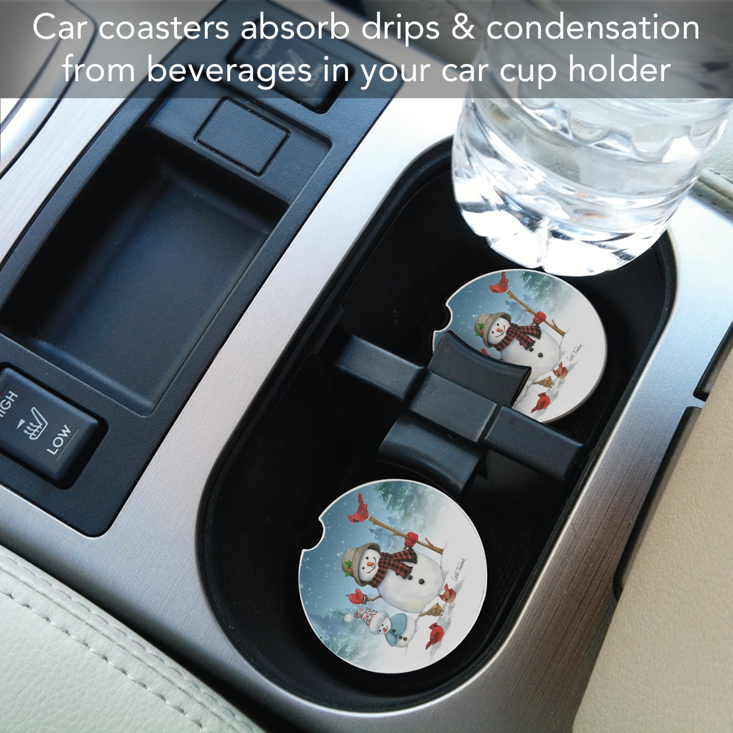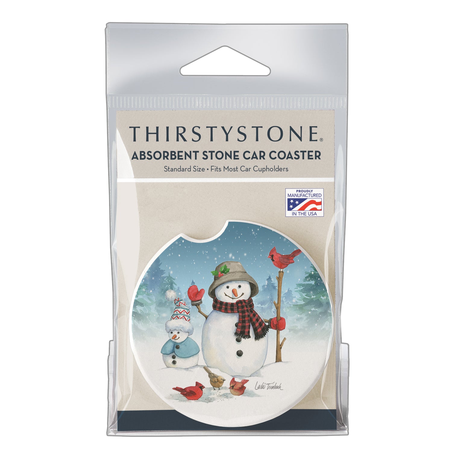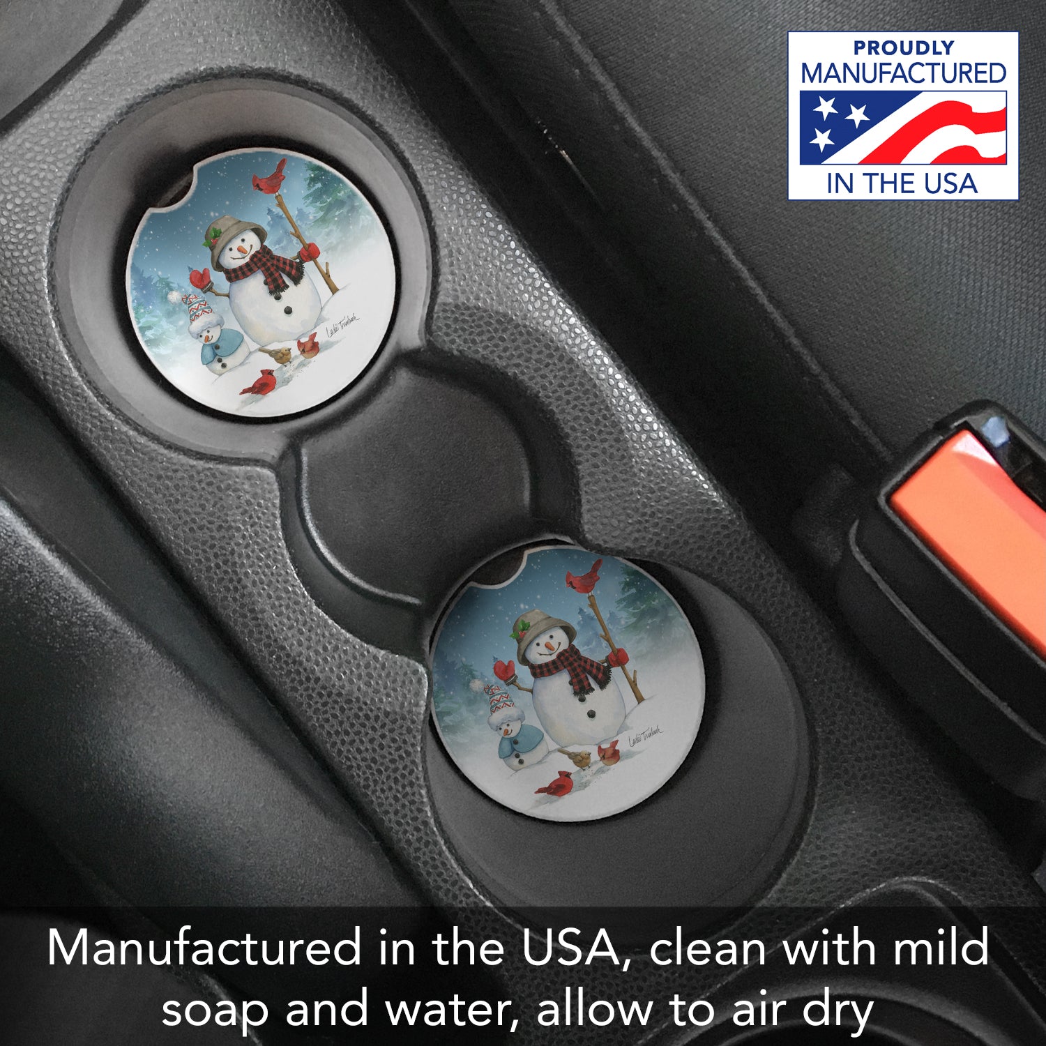 Snowman Family Single Absorbent Stone Car Coaster 2.6” Diameter Manufactured in the USA