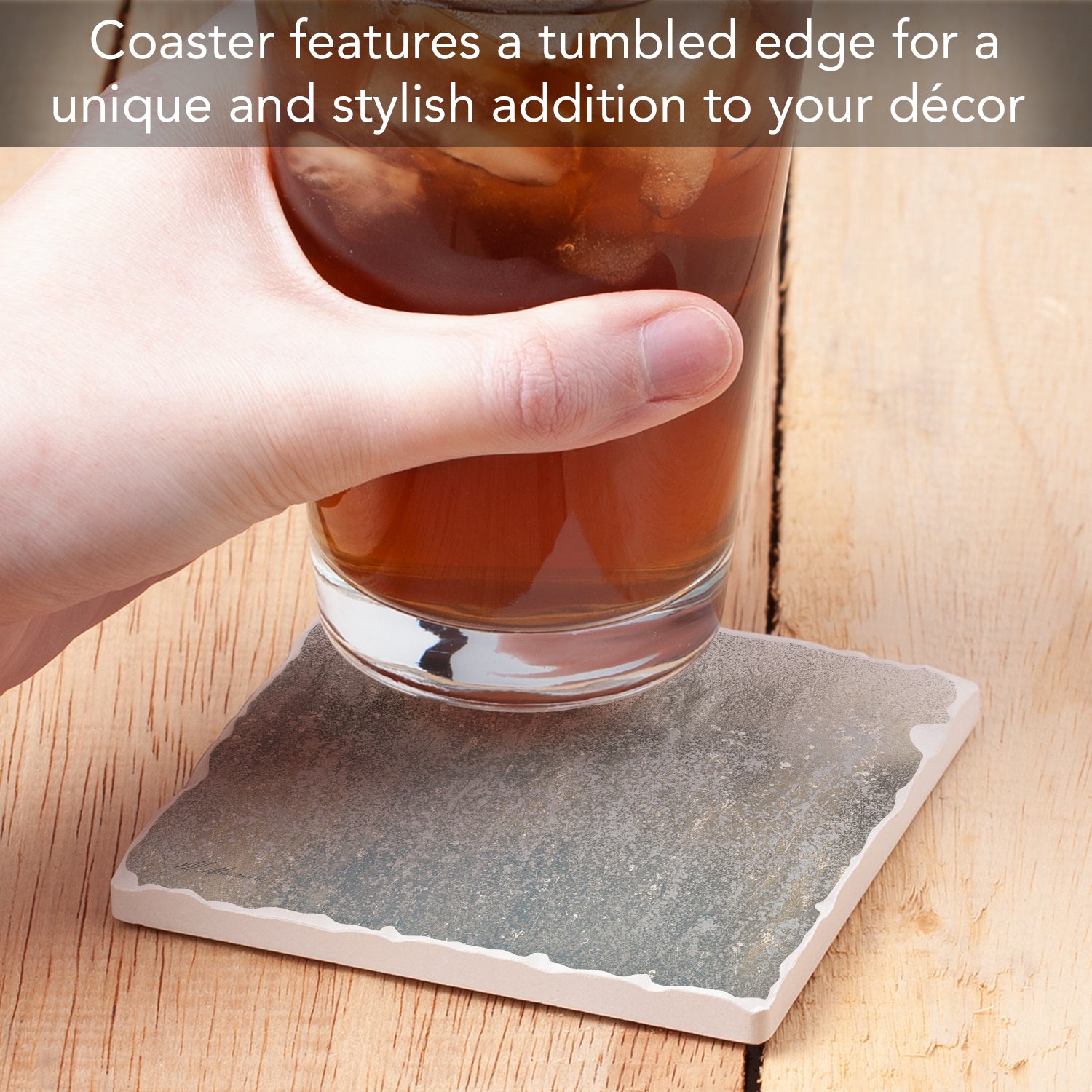 - TUMBLED TILE EDGE/CORK BACKING-Coasters feature a Tumbled Tile edge giving the Coaster a classic but rustic appearance. Features a cork backing to protect your furniture, countertop or desktop from scratches and stains.