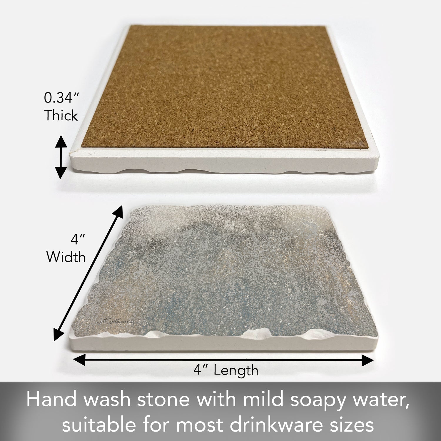 - ARTISTIC DESIGN-Beautiful artistic design allows the Coaster to remain displayed even when not in use. Each Coaster measures 4" x 4" x .25". Sized to fit larger Mugs & Glasses.