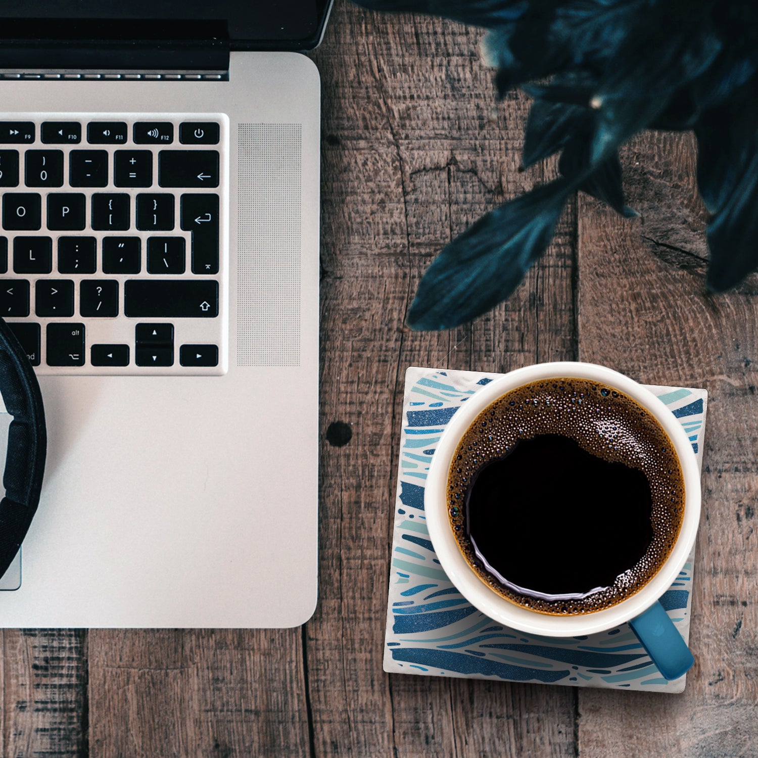 FUNCTIONAL ART-Beautiful artistic design allows the Coaster to remain displayed even when not in use. Each Coaster measures 4” x 4” x .25”. Sized to fit larger Mugs & Glasses.