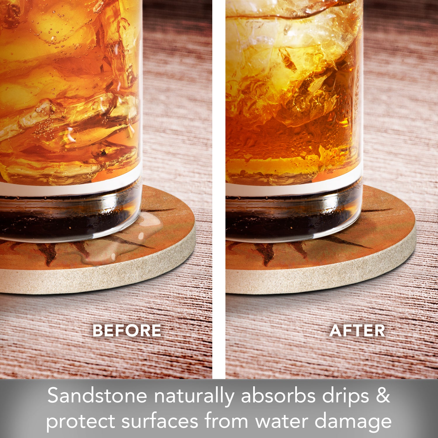 MEASUREMENTS-Each coaster measures 4” round. Sandstone coasters are easy to clean with a damp cloth or sponge. Beautiful artistic design allows the Coasters to remain displayed even when not in use.