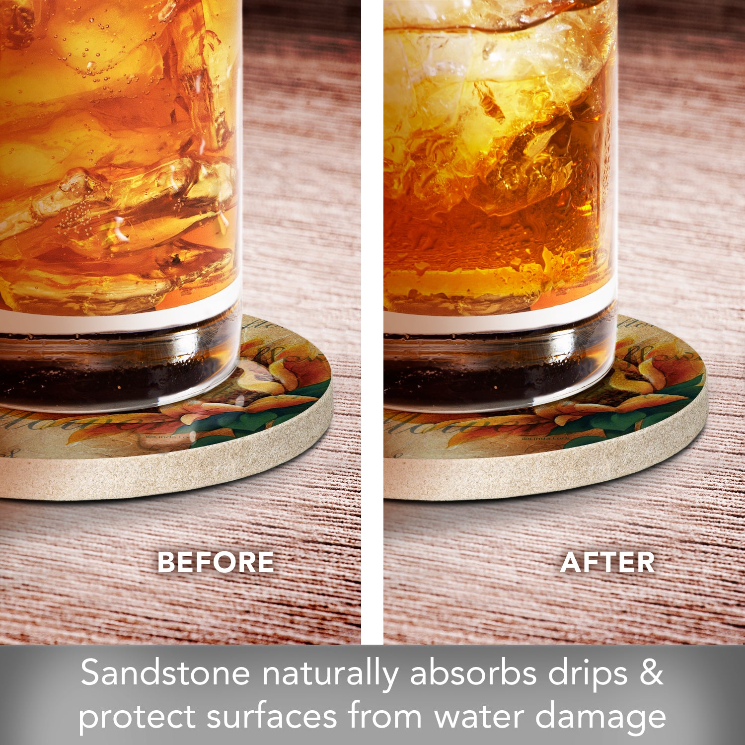 ABSORBENT-Sandstone is naturally absorbent. These Sandstone Coasters will continually absorb condensation from beverages. Sandstone is also heat tolerant, making it a great choice for protecting tables and countertops from hot beverages.