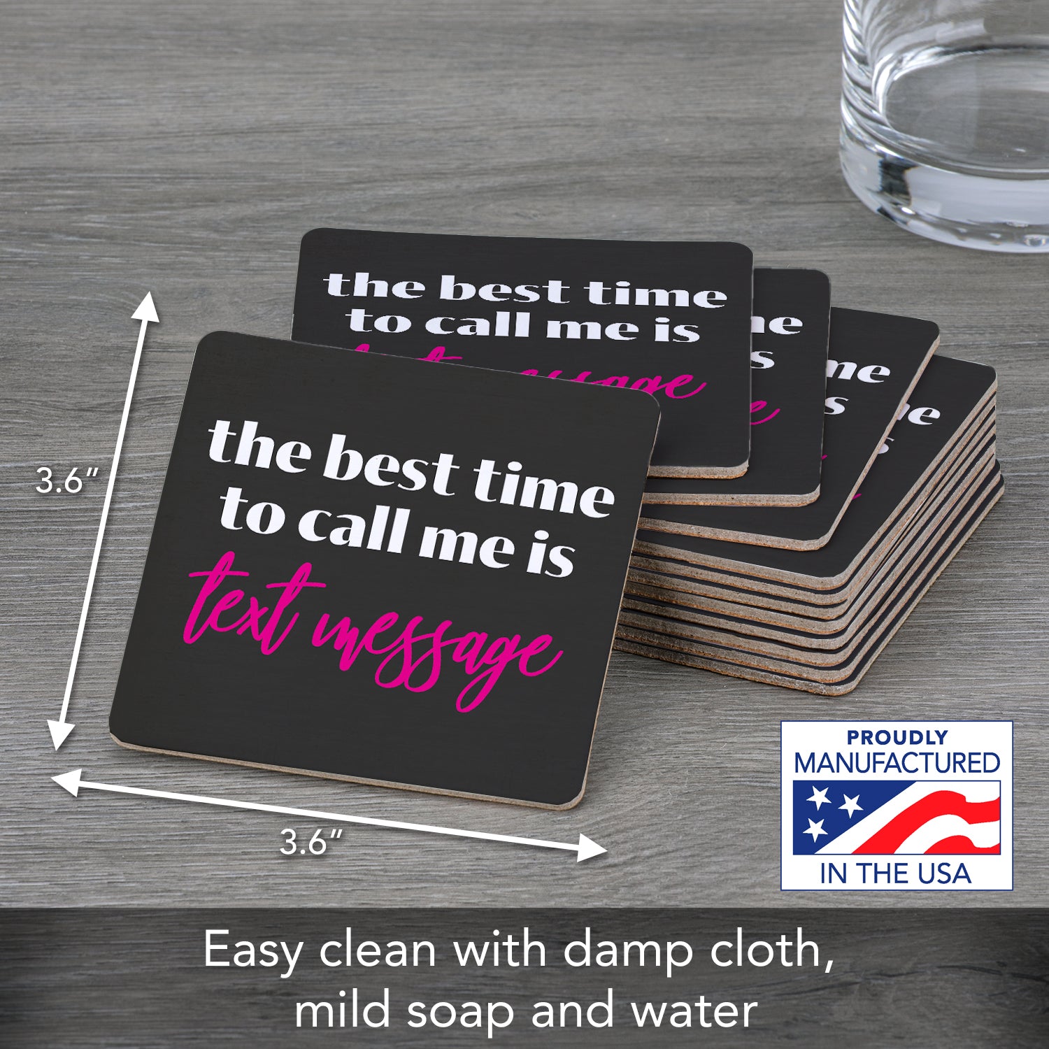 MEASUREMENTS- Coaster measures 3.6" x 3.6" x 0.15" square. Coasters are eco-friendly and reusable until soiled.