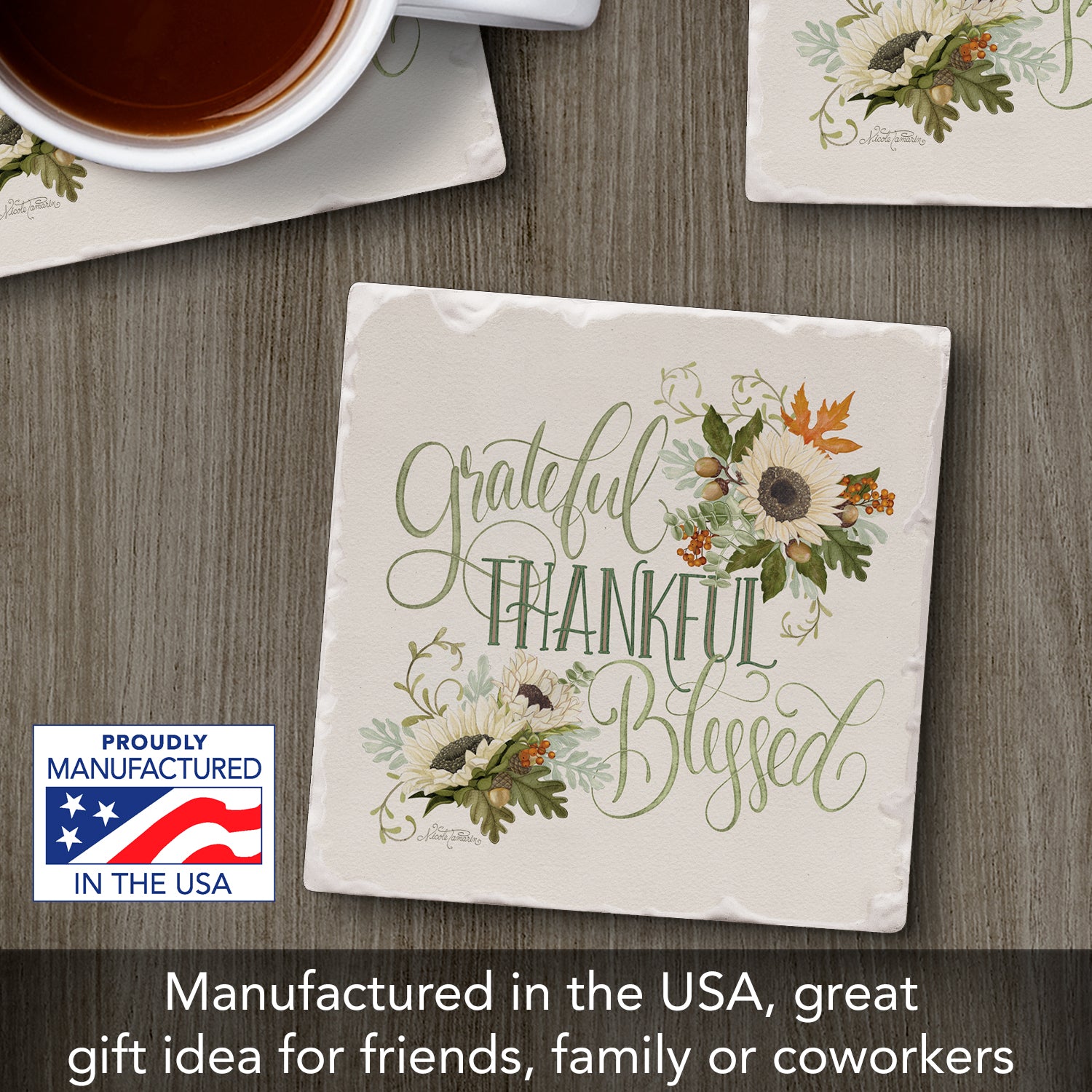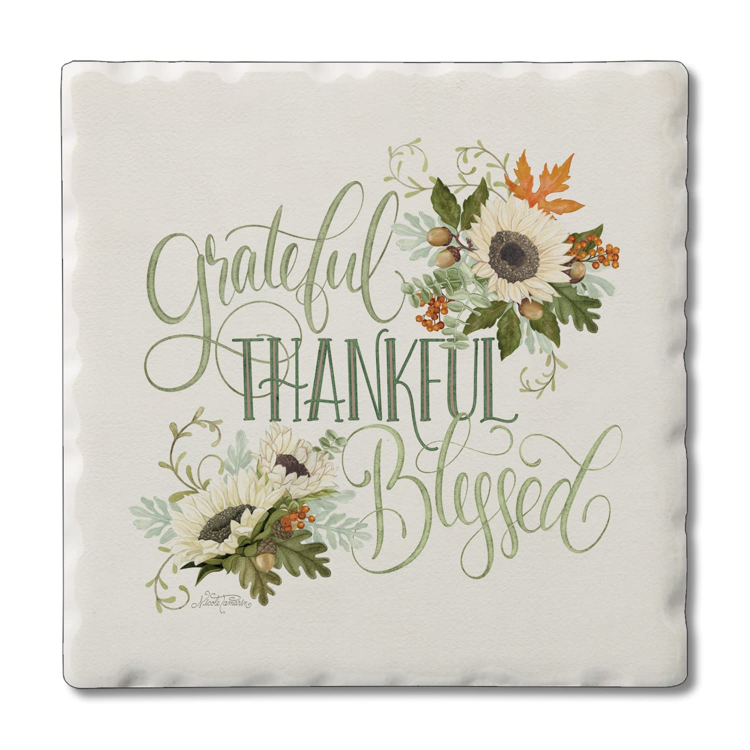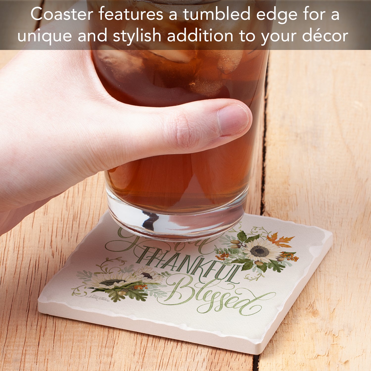 Thirstystone Thankful Single Tumbled Tile Stone Coaster with Protective Cork Backing Manufactured in The USA 4" Square, Colorful, Artistic, Easily Wipes Clean
