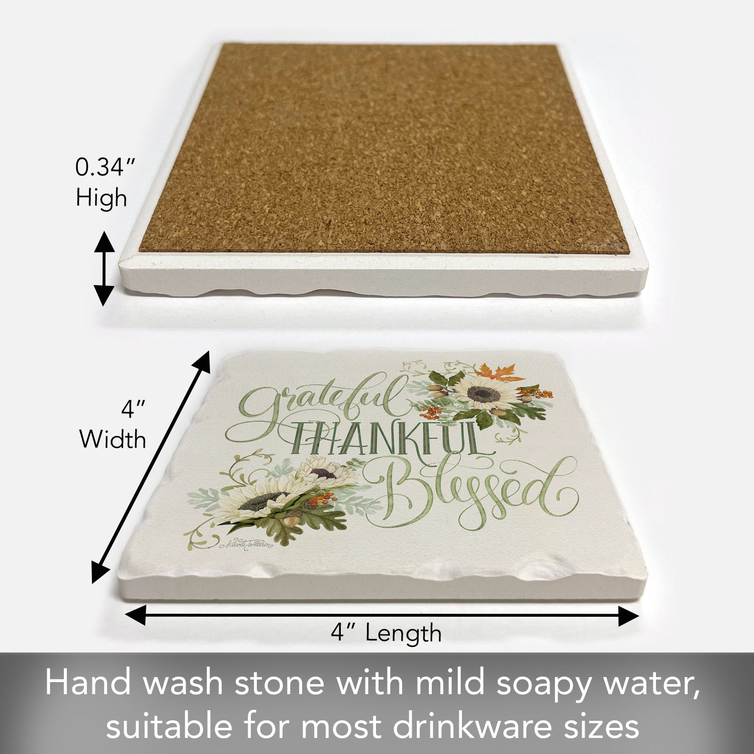 FUNCTIONAL ART-Beautiful artistic design allows the Coaster to remain displayed even when not in use. Each Coaster measures 4” x 4” x .25”. Sized to fit larger Mugs & Glasses.