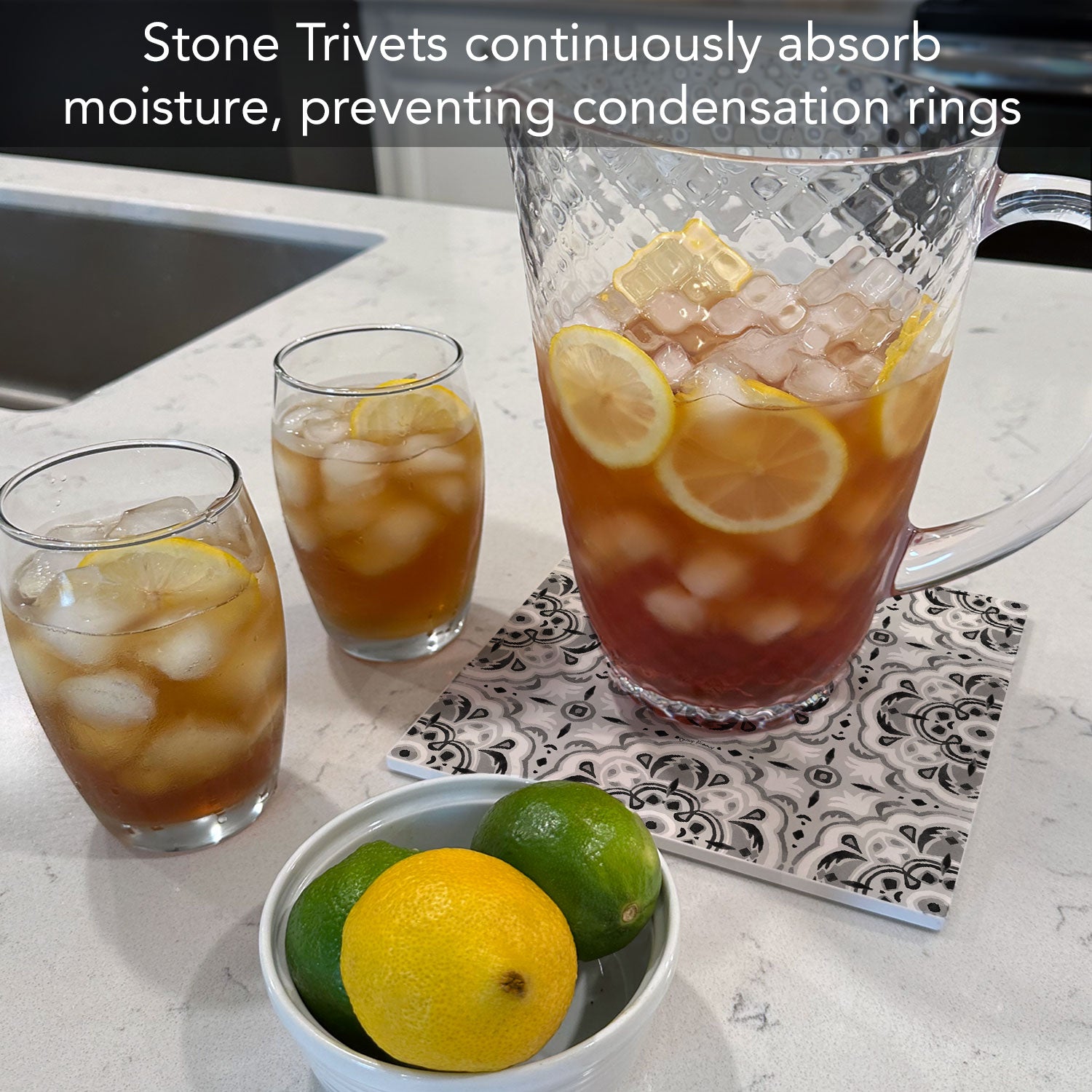 DURABLE-Trivet is made from strong durable ceramic stone. Stone absorbs heat and distributes it throughout the Trivet to keep from damaging your favorite pots and surfaces.