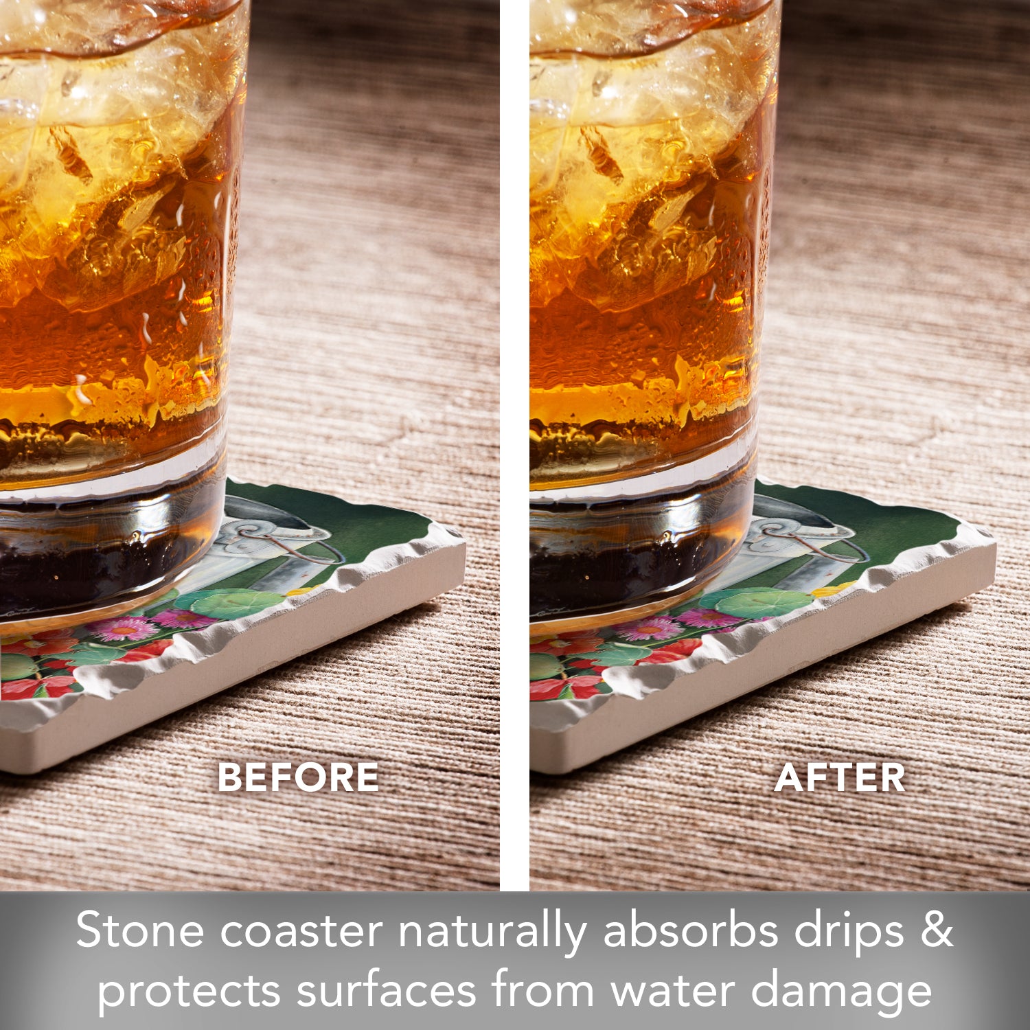 FUNCTIONAL ART-Beautiful artistic design allows the Coaster to remain displayed even when not in use. Each Coaster measures 4” x 4” x .25”. Sized to fit larger Mugs & Glasses.
