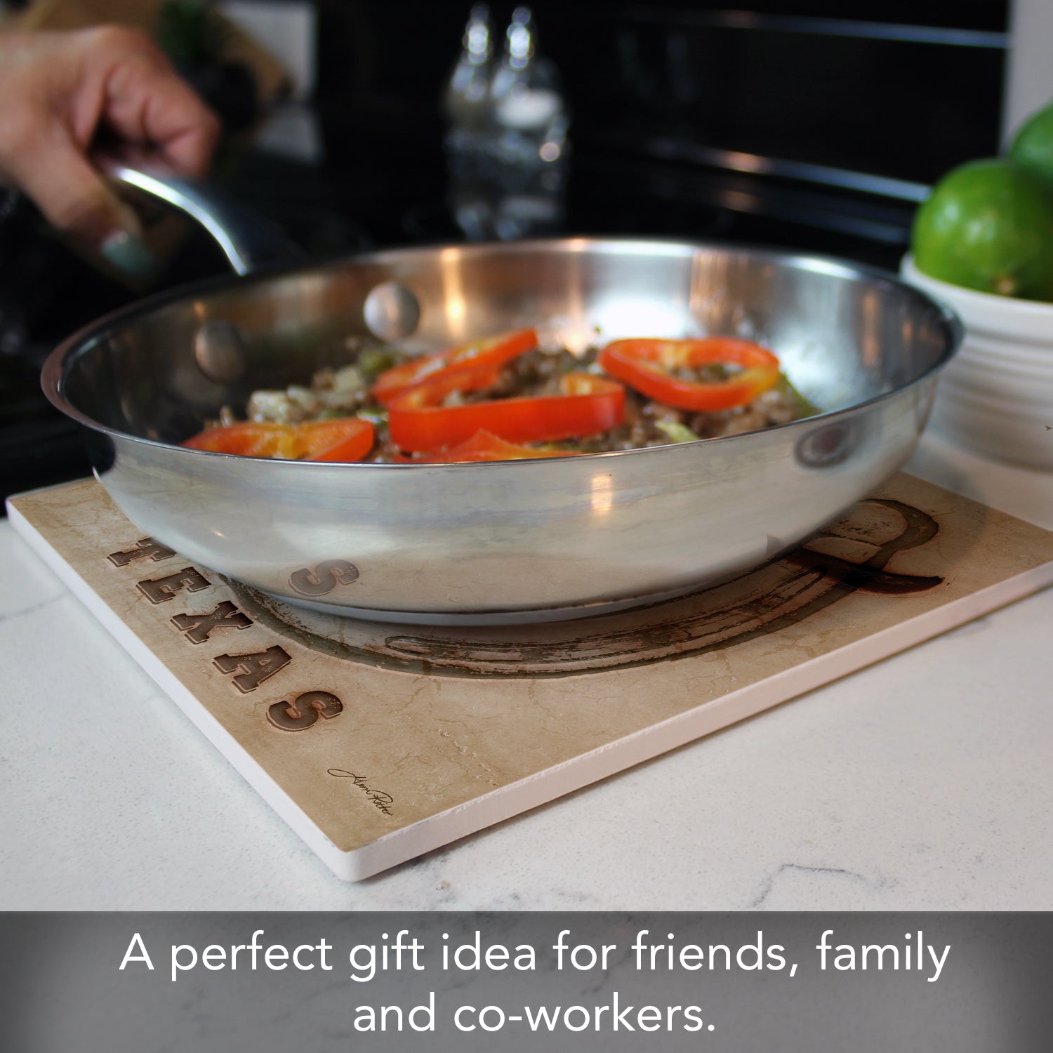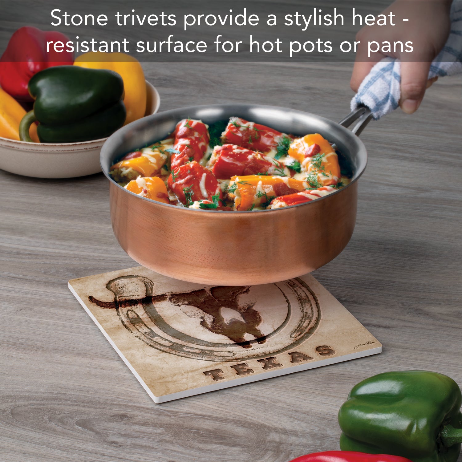 DURABLE-Trivet is made from strong durable ceramic stone. Stone absorbs heat and distributes it throughout the Trivet to keep from damaging your favorite pots and surfaces.