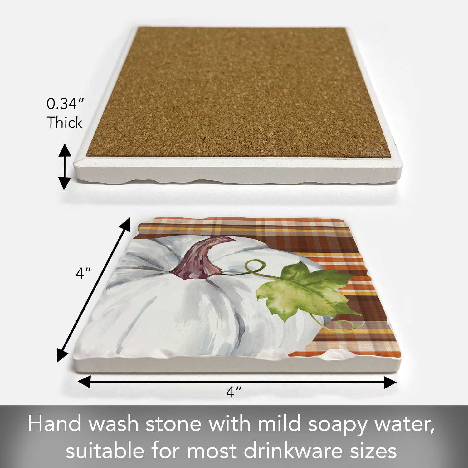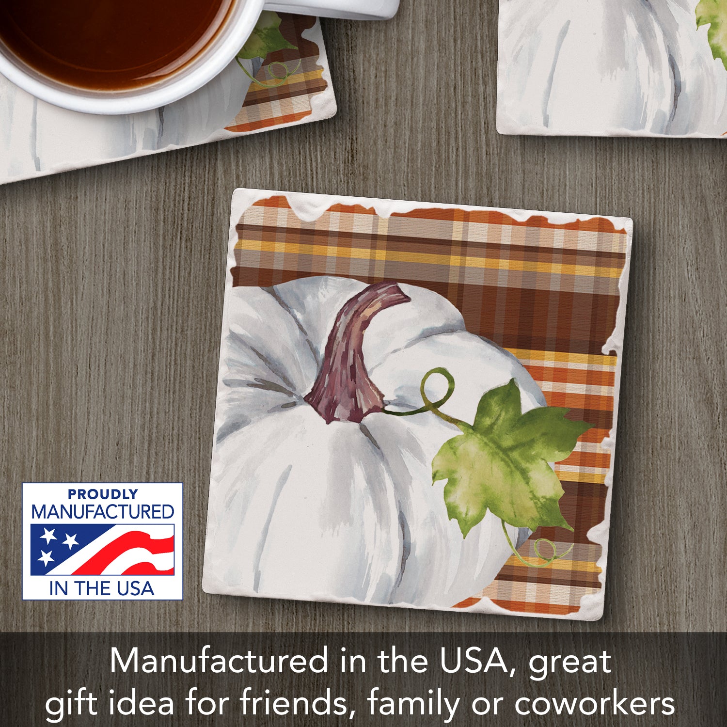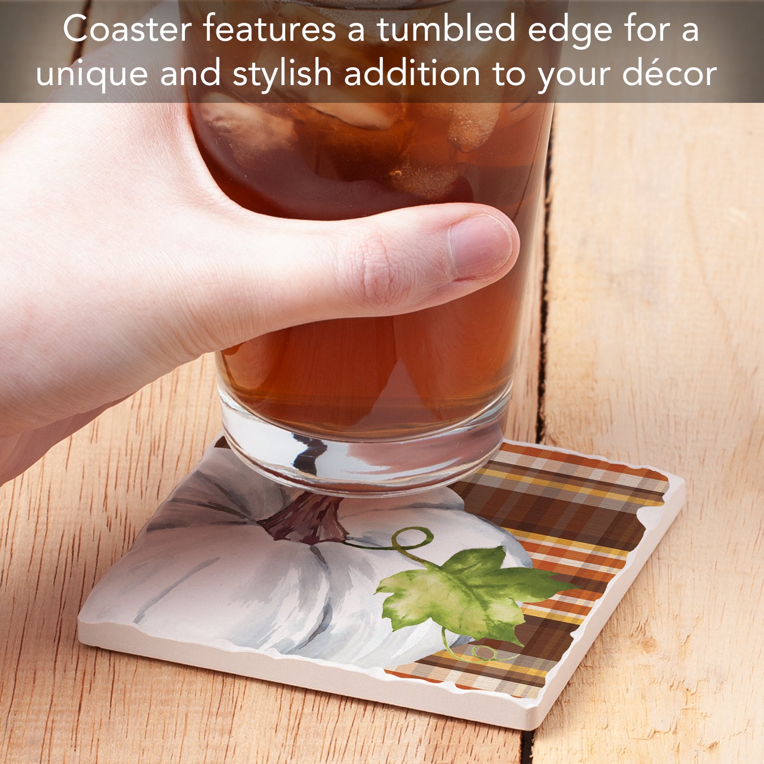 Thirstystone White Pumpkin on Plaid Single Tumbled Tile Stone Coaster with Protective Cork Backing Manufactured in The USA 4" Square, Colorful, Artistiic, Easily Wipes Clean