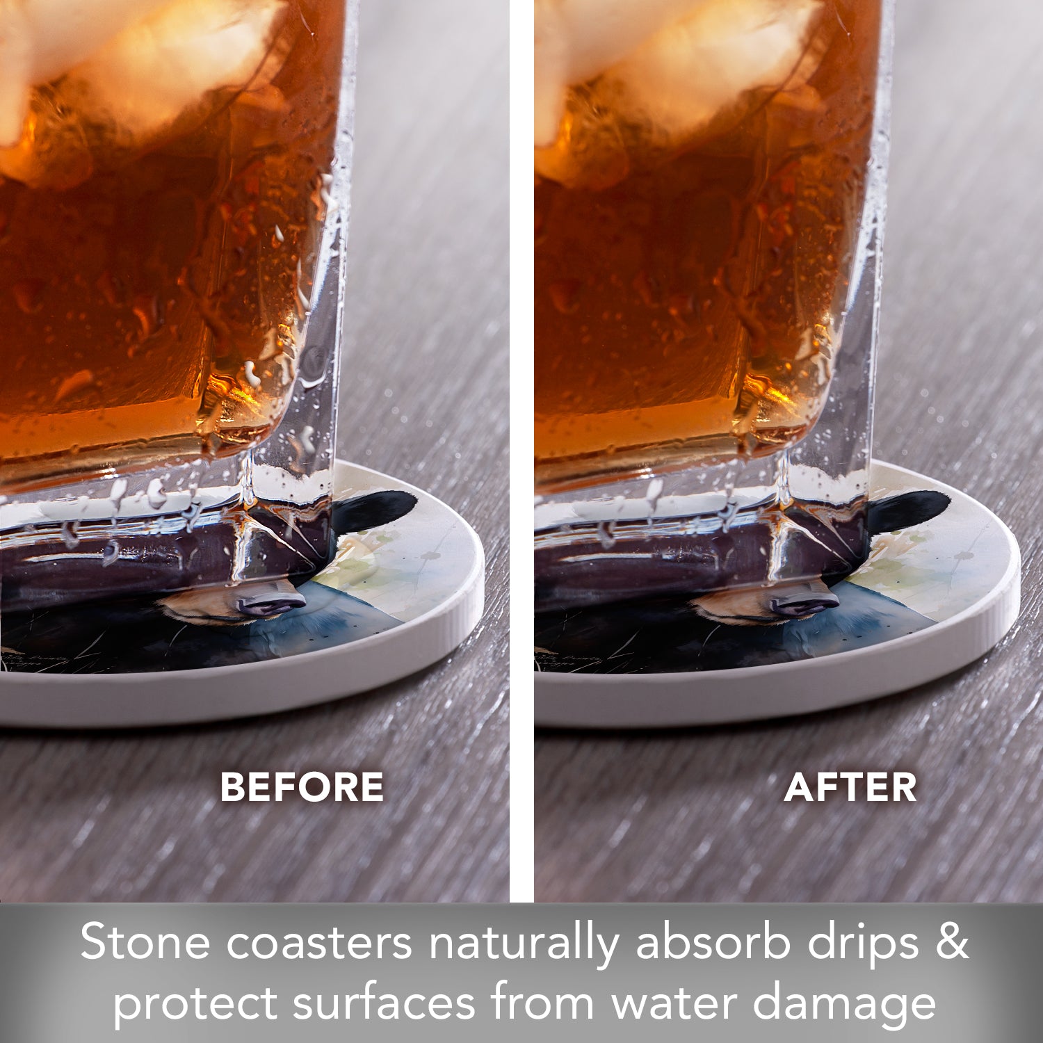 ABSORBENT STONE-Set of 4 natural absorbent stone coasters. Constructed of absorbent stone that absorbs drips and condensation from beverages continuously. Absorption prevents rings and stains on your furniture. Smooth, finished edge completes these round Coasters.