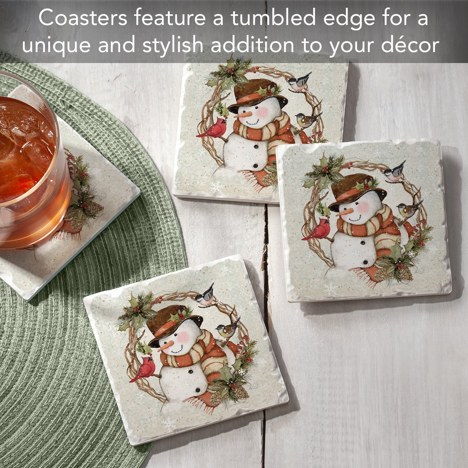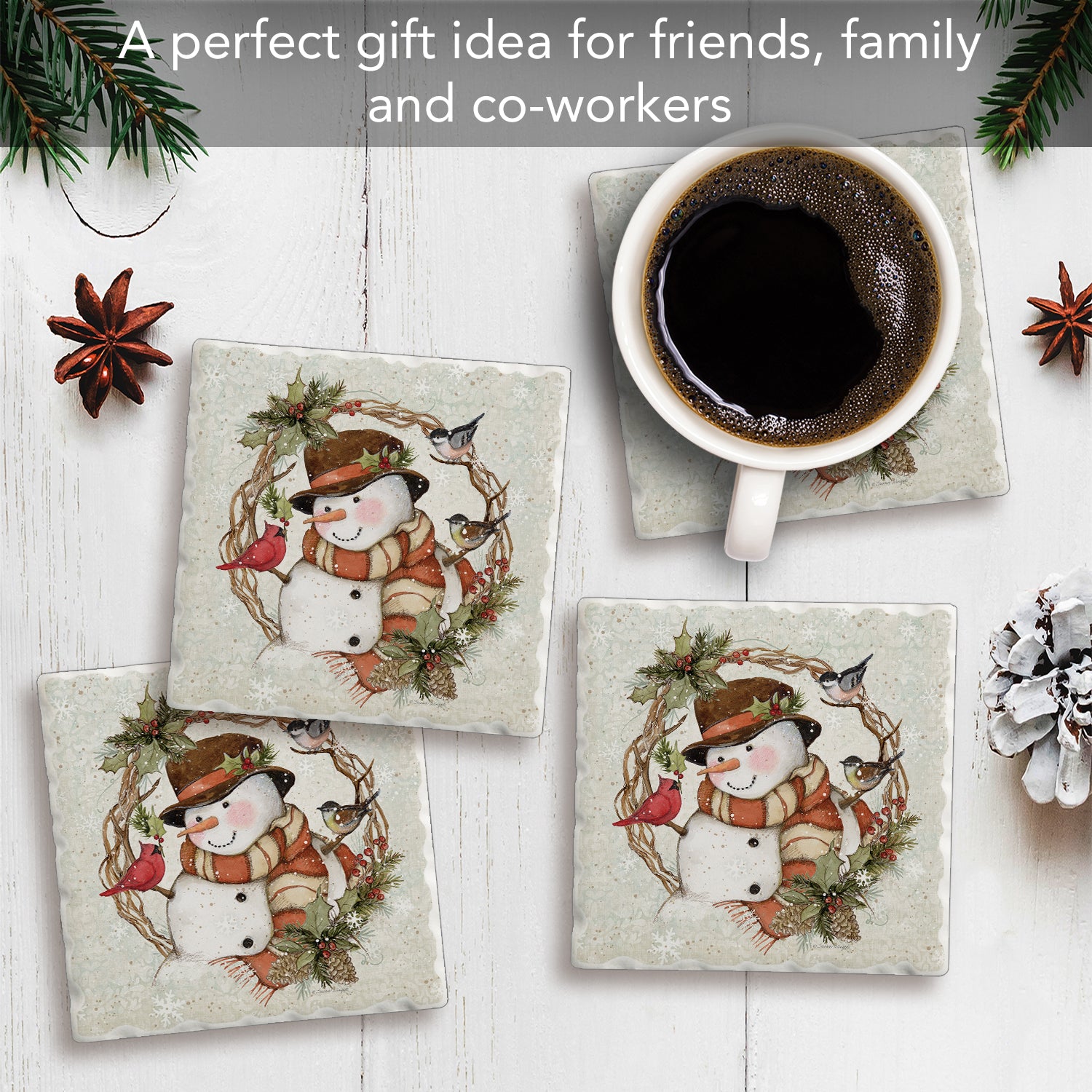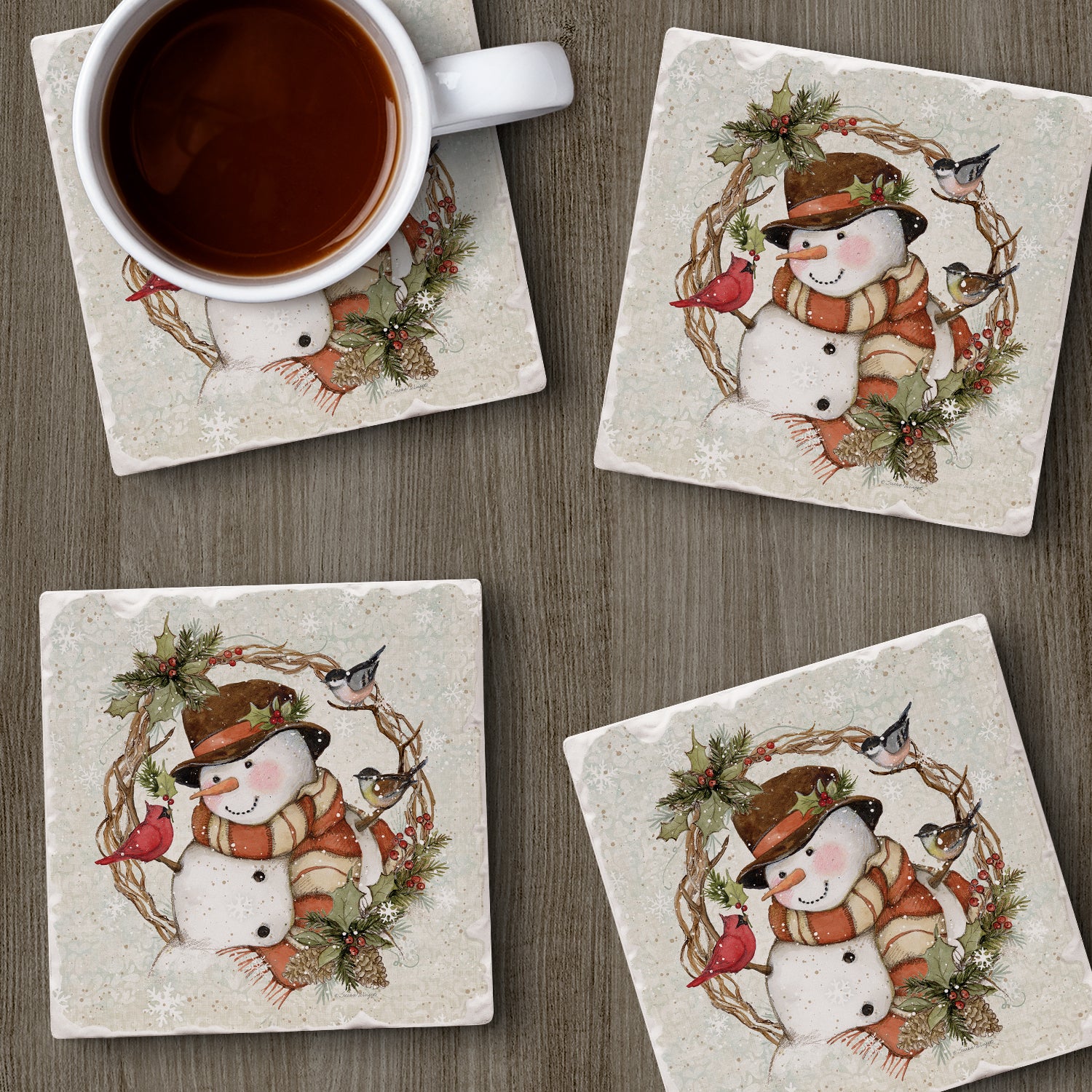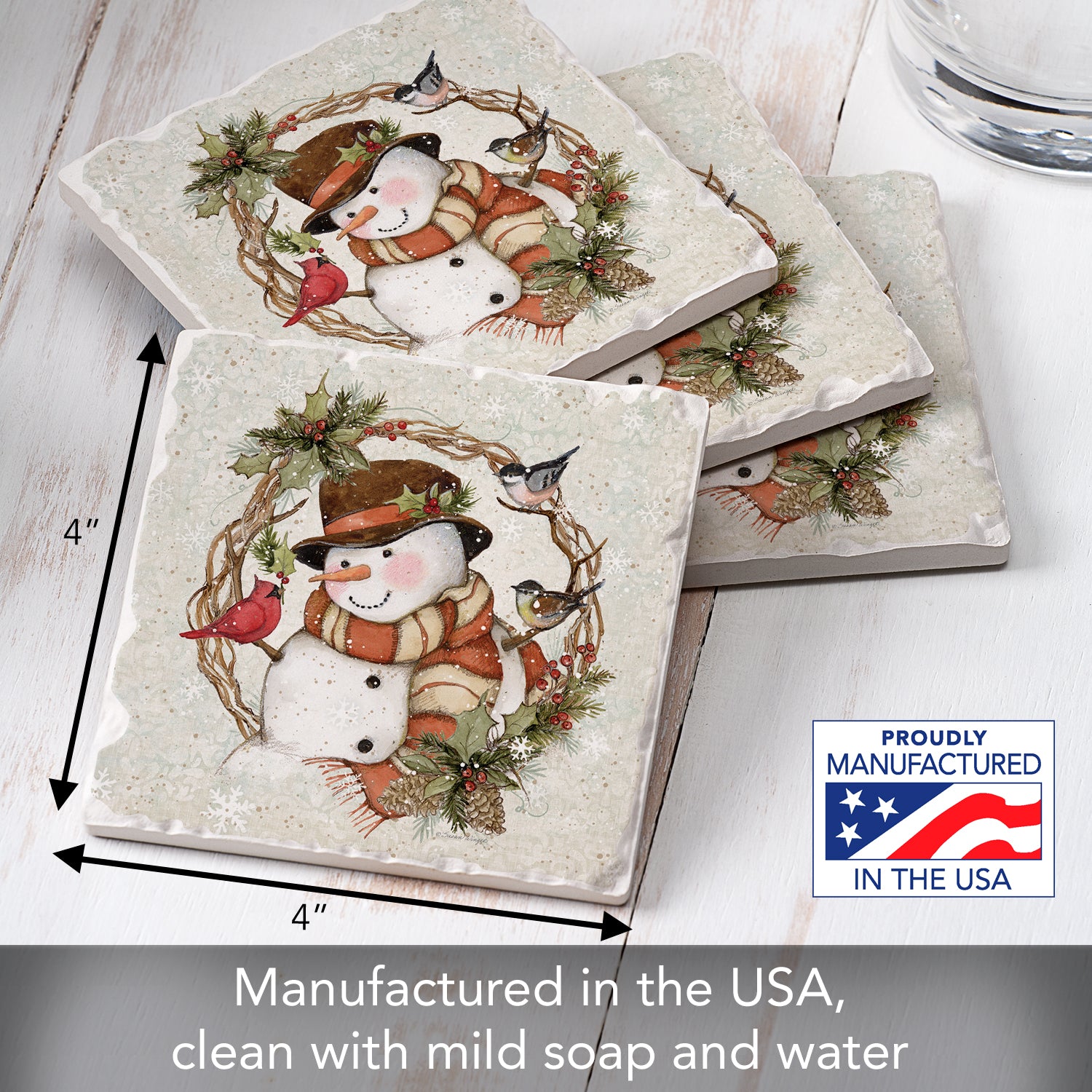 Thirstystone Winter Forest Snowman 4 Pack Tumbled Tile Stone Coasters 4" Square Manufactured in the USA