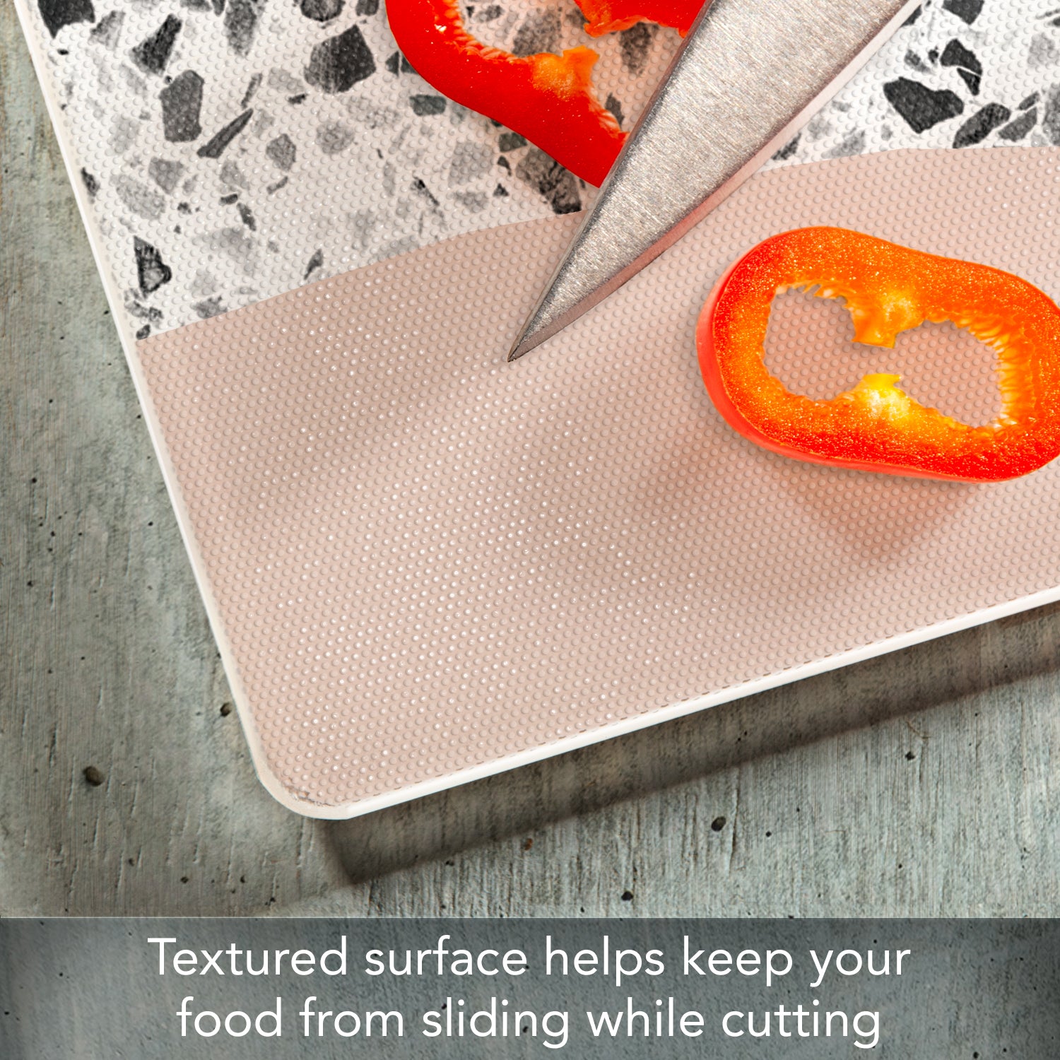 - FEATURES-Surface of Cutting Board is slightly textured to help keep foods stable as they are being chopped and diced. Rubber Non-Skid feet on bottom of the board protects your surfaces from scratches and stains.