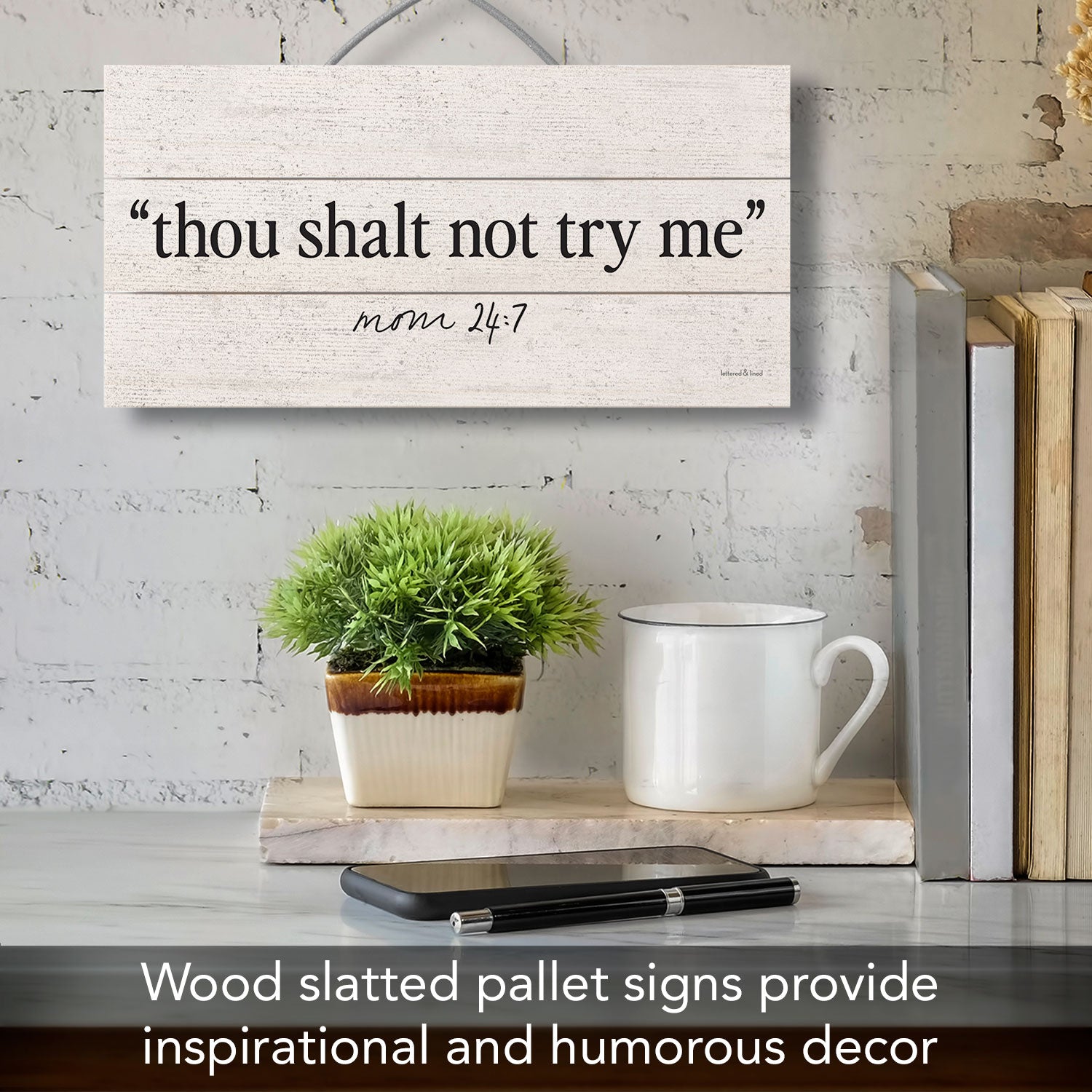 VERSATILE DISPLAY-Slatted wall sign features a wire hanger on the back for convenience when hanging. The wire hanger also doubles as an easel to sit on a desk, mantel, or shelf.