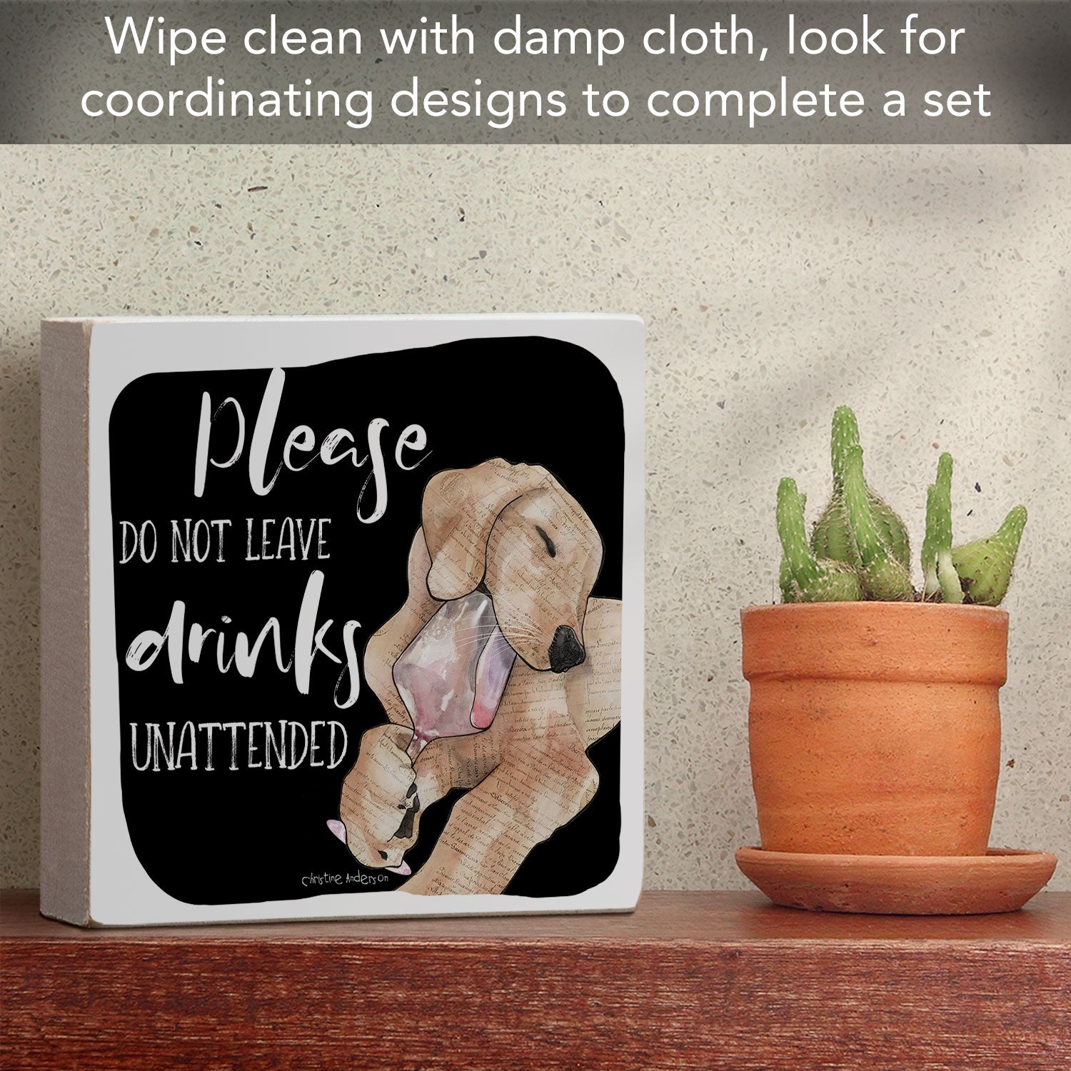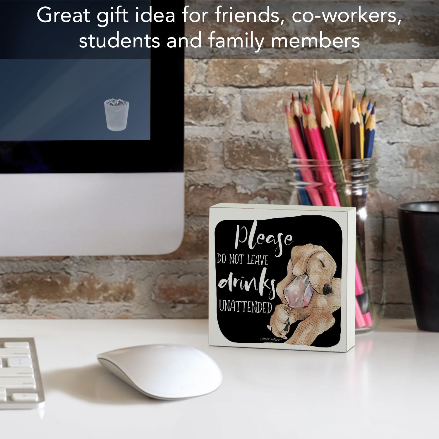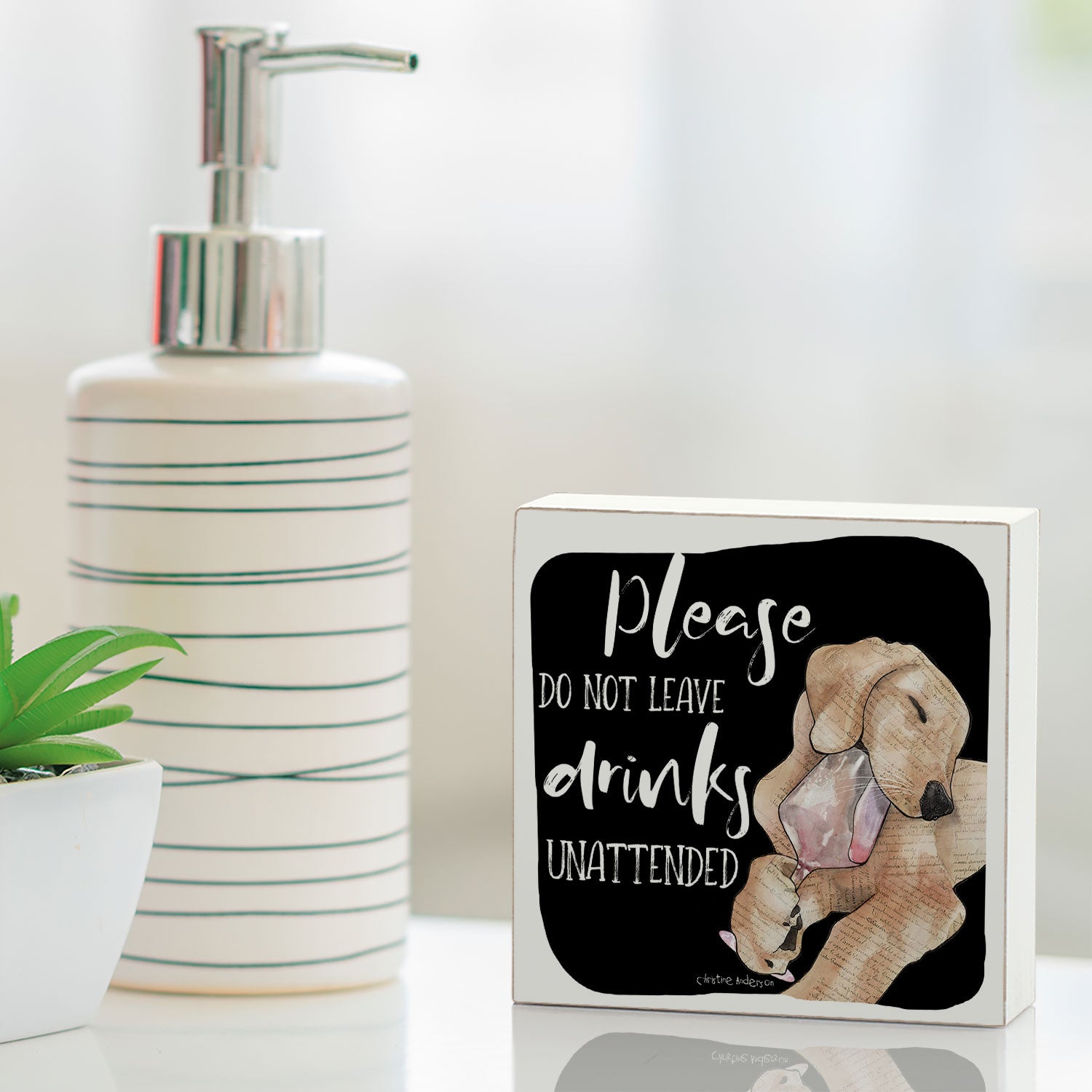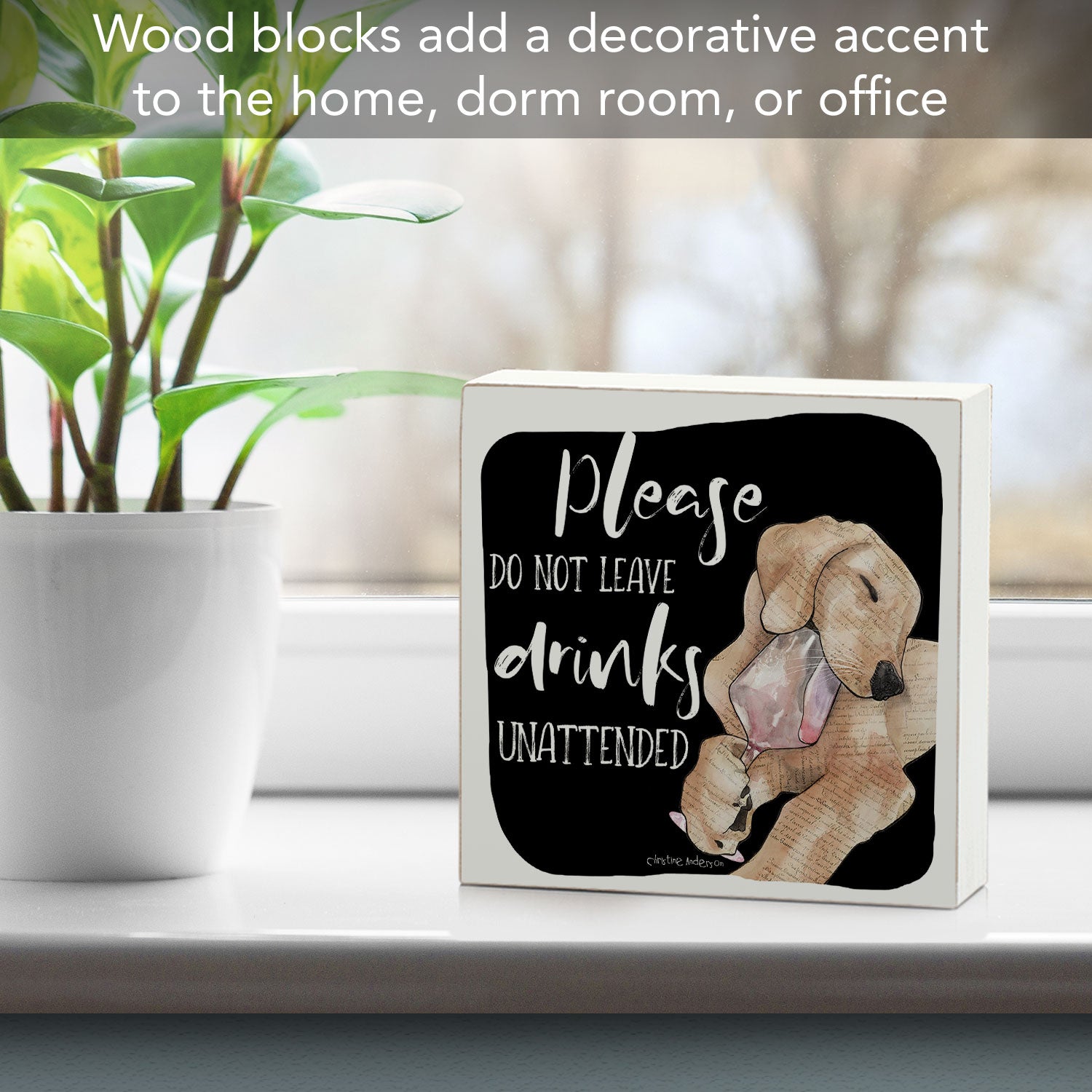Unattended Dog Artistic Freestanding Solid Wood Block Sign Made in the USA 3.75” Square