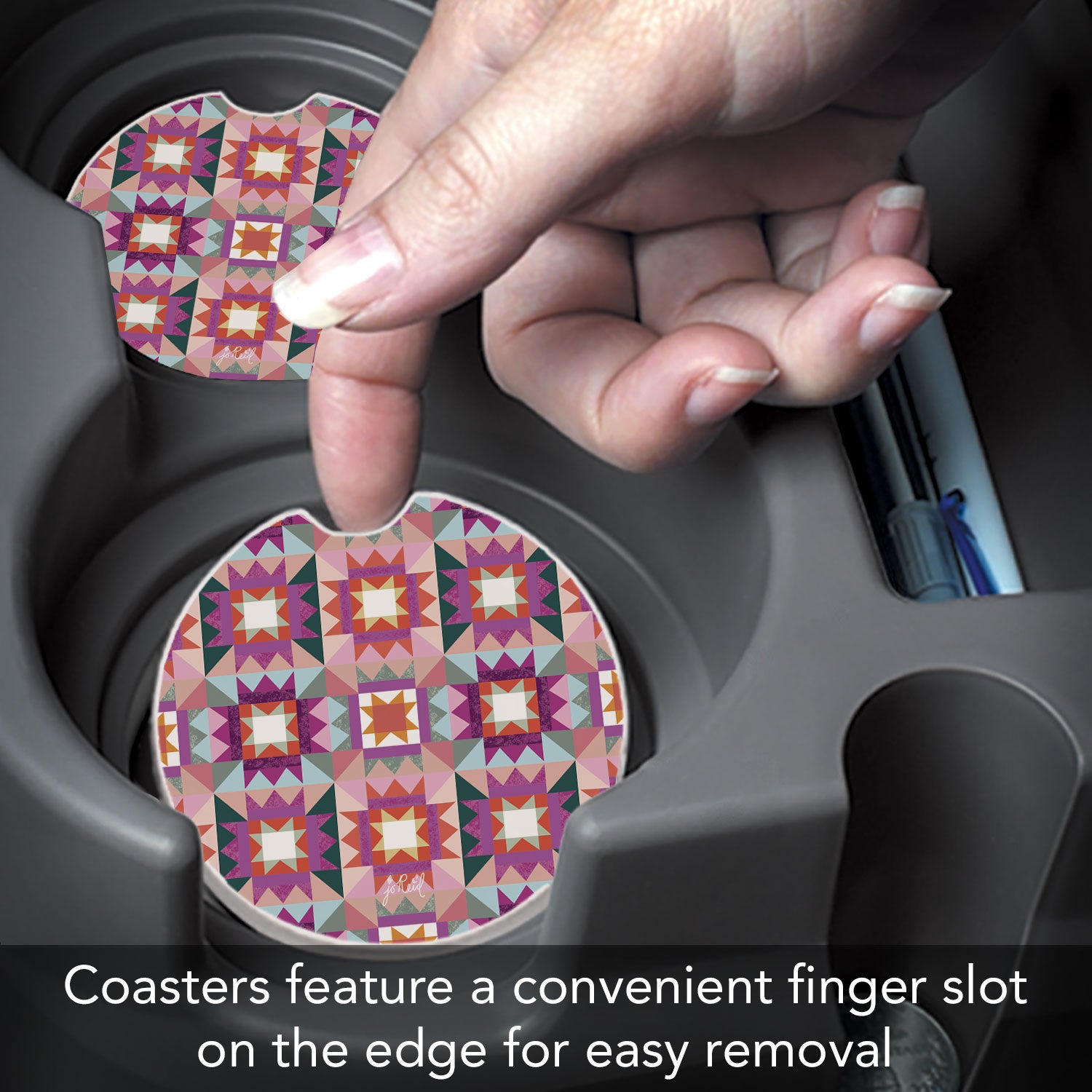 FEATURES-Car Coaster features a convenient finger slot on the edge for easy removal from cup holder. Car Coaster assists in keeping your vehicle cup holder clean and dry. Easy to remove when detailing your car. Designed to fit cup holders in most cars, trucks, or boats.